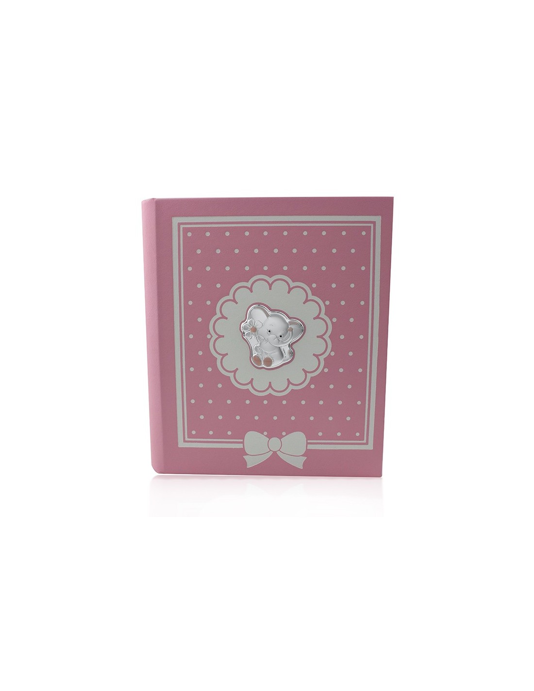Álbum infantil en color rosa con detalle elefante en plata bilaminada. El álbum mide 20 x25 y contiene 30 hojas para fotos.