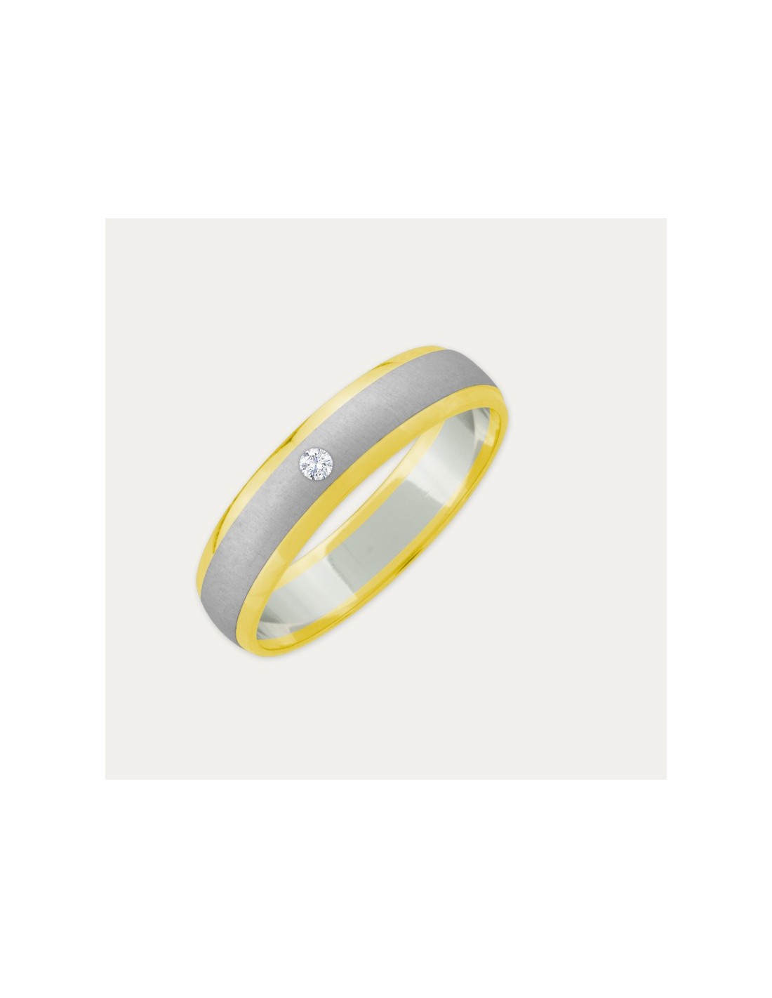 Alianza de boda oro 18k bicolor con franja mate en oro blanco y un brillante.