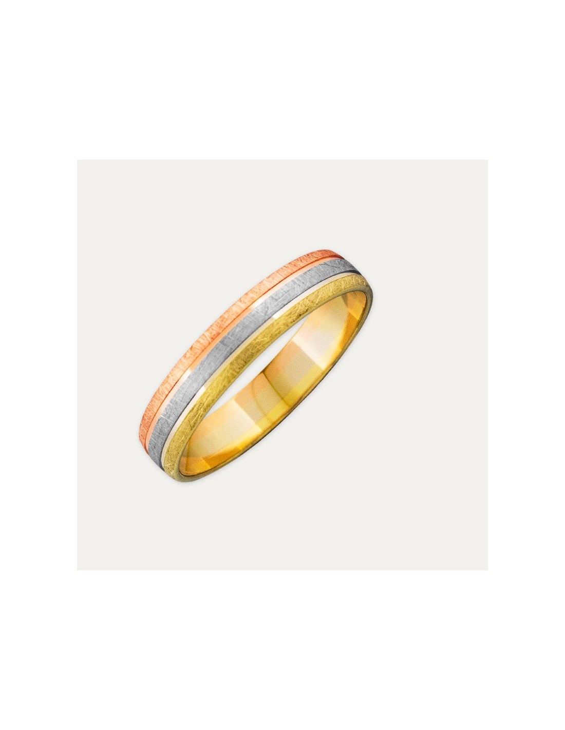 Alianza en Oro 18 kilates tricolor en amarillo, blanco y rosa. Esta pieza de acabado mate con dos franjas que separan los tres colores, llama la atención por su atractivo y acabado cuidado al detalle.