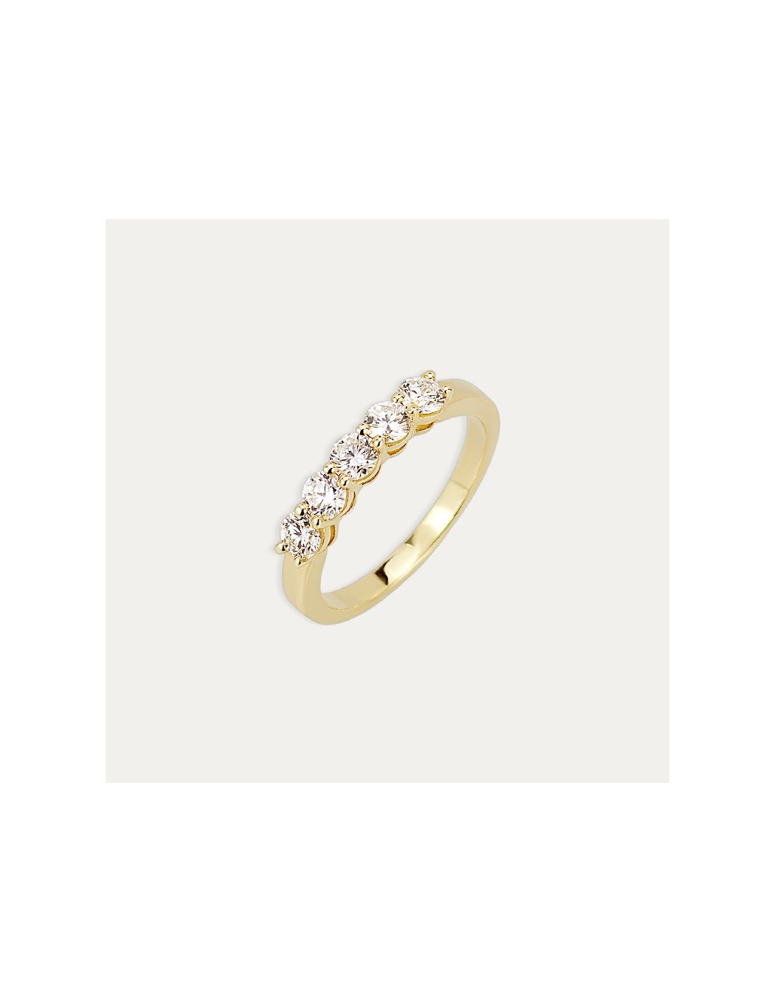 Anillo fabricado en Oro de 9 kilates de estilo cinquillo con cinco diamantes creados. Una joya sorprendentemente elegante y que brilla con luz propia.