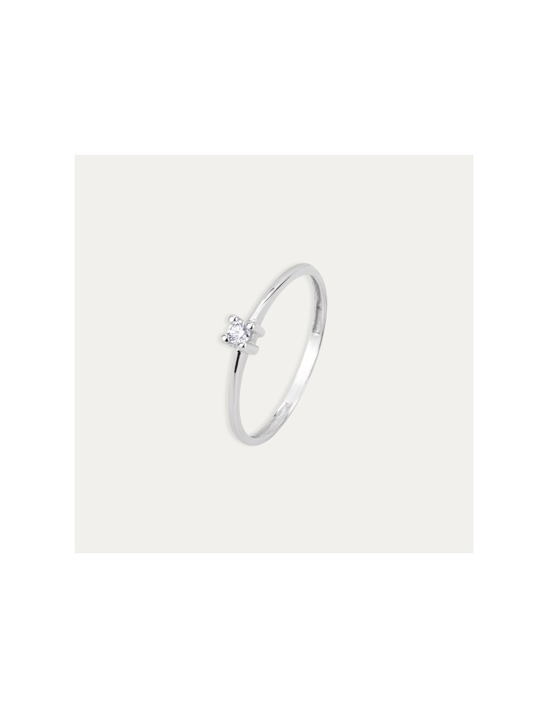 Anillo de Oro blanco 9 kilates con un precioso diamante creado de 0,06 cts en 4 garras. Descubre esta estupenda joya con la que darte un capricho especial o hacer un regalo con el que deslumbrar.