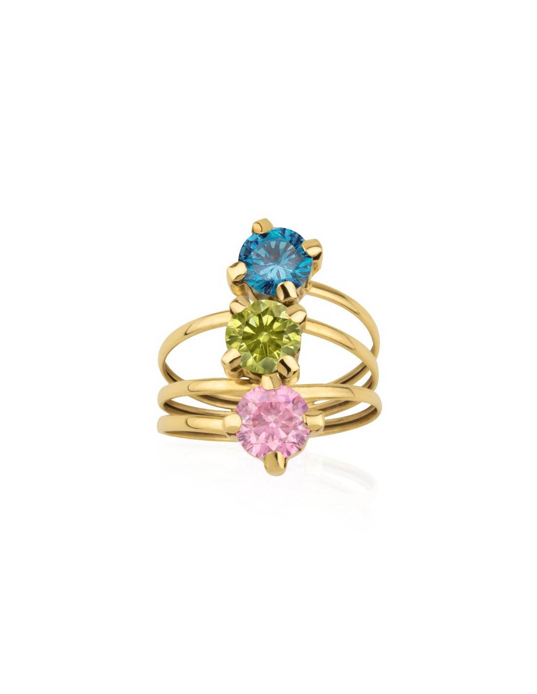 Anillo en Oro 9 kilates en varios aros con tres piedras de color esmeralda, azul y rosa.