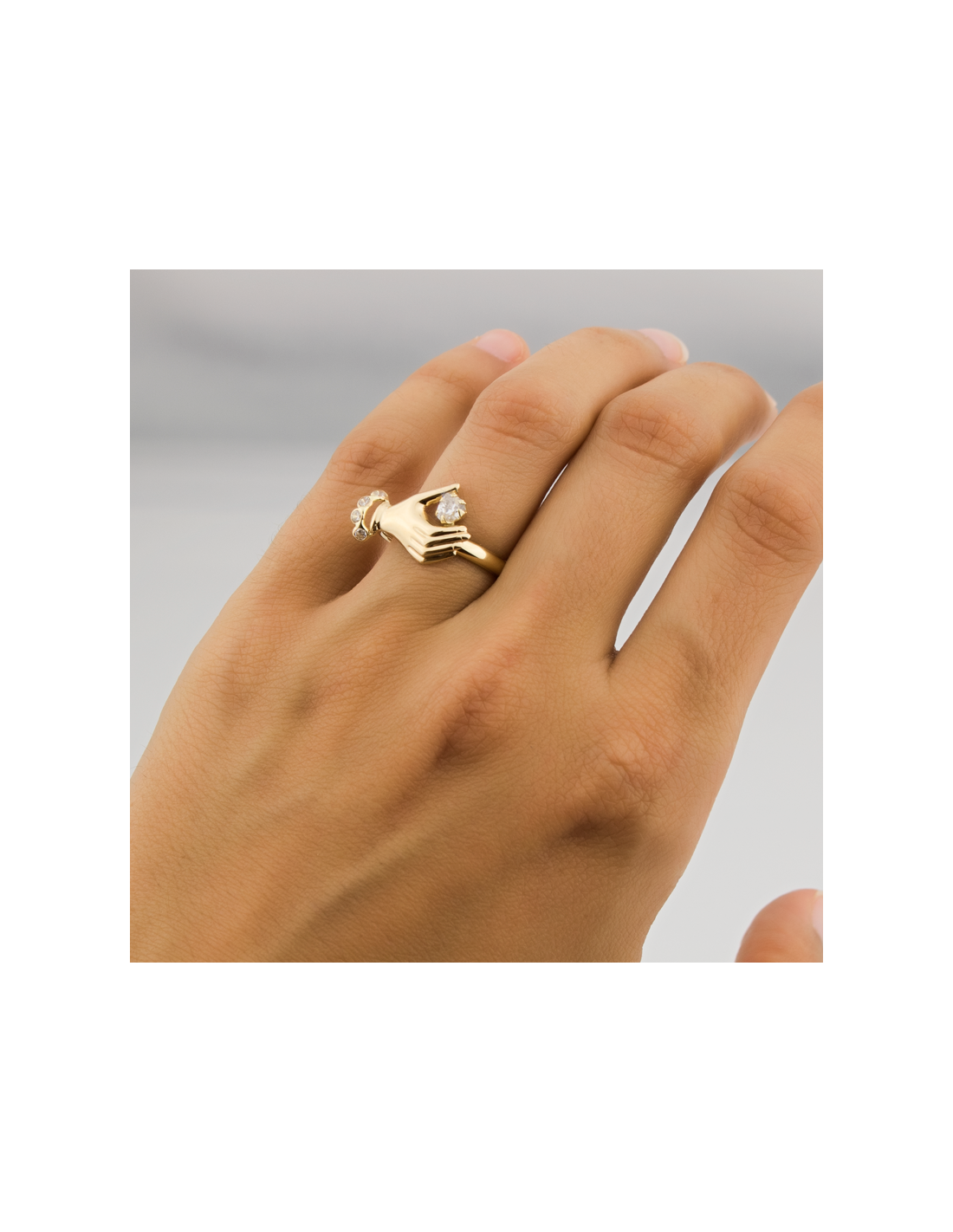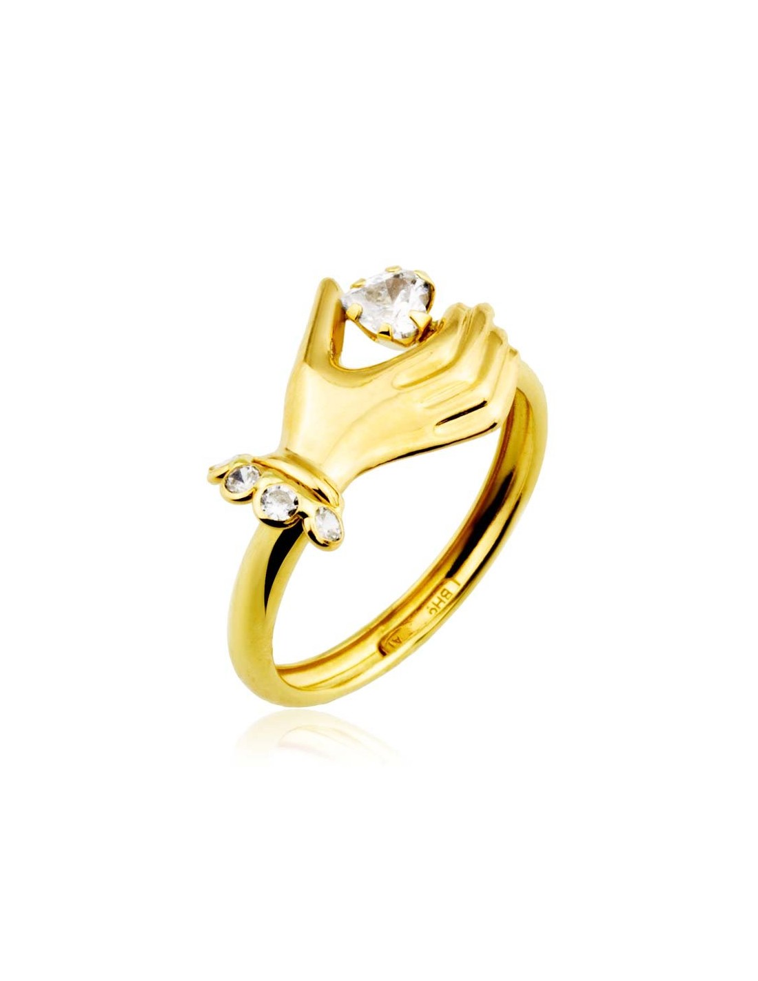 Sortija en Oro 9 kilates amarillo con motivo de mano, circonitas y una en forma de corazón en garra.