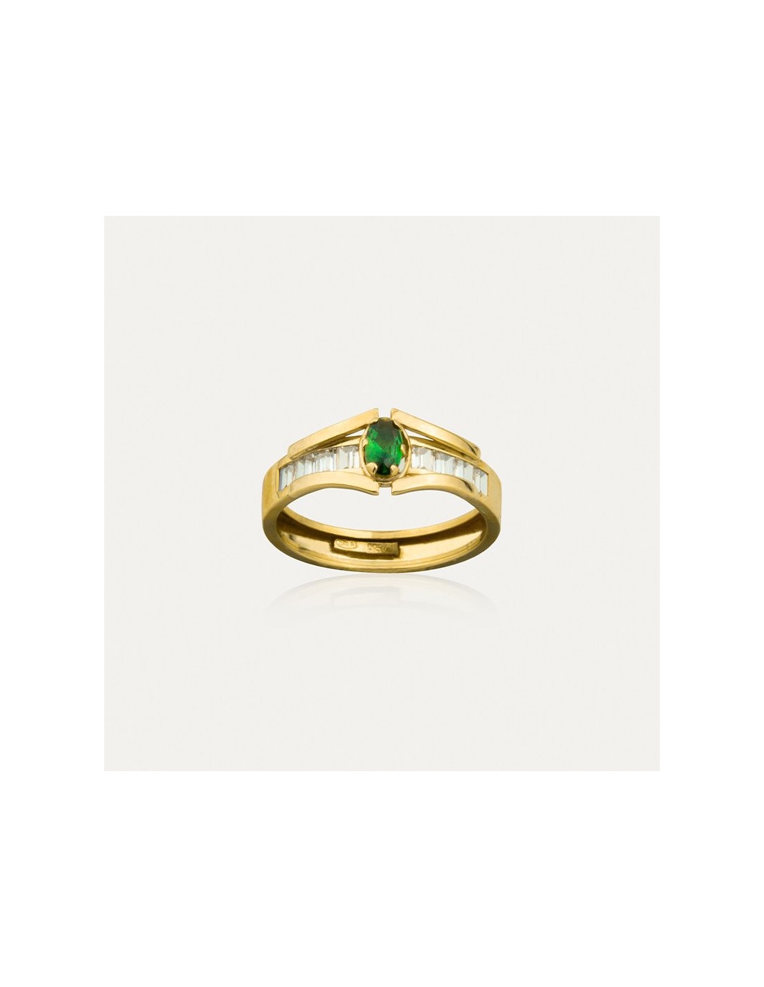 Anillo en Oro 9 quilates, con circonitas en carril y piedra central color esmeralda.