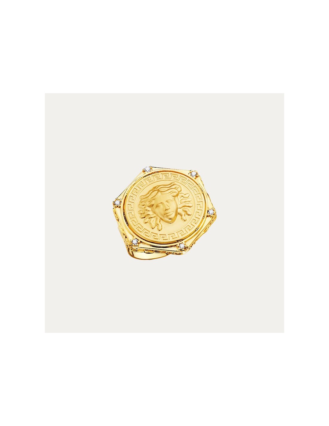 Sortija en Oro de 18 kilates con forma hexagonal decorada con la cara de medusa en relieve además de 6 circonitas en cada esquina, con textura de greca y detalles grabados en ambos brazos.