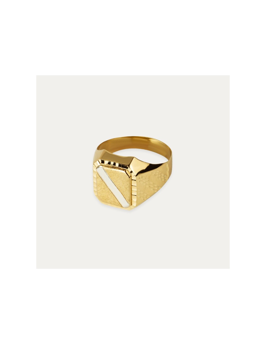 Sello en forma rectangular con una franja diagonal en Oro blanco, todo el anillo esta fabricado en Oro de 9 kilates. Da a este anillo un toque especial y personalízalo con tu inicial.