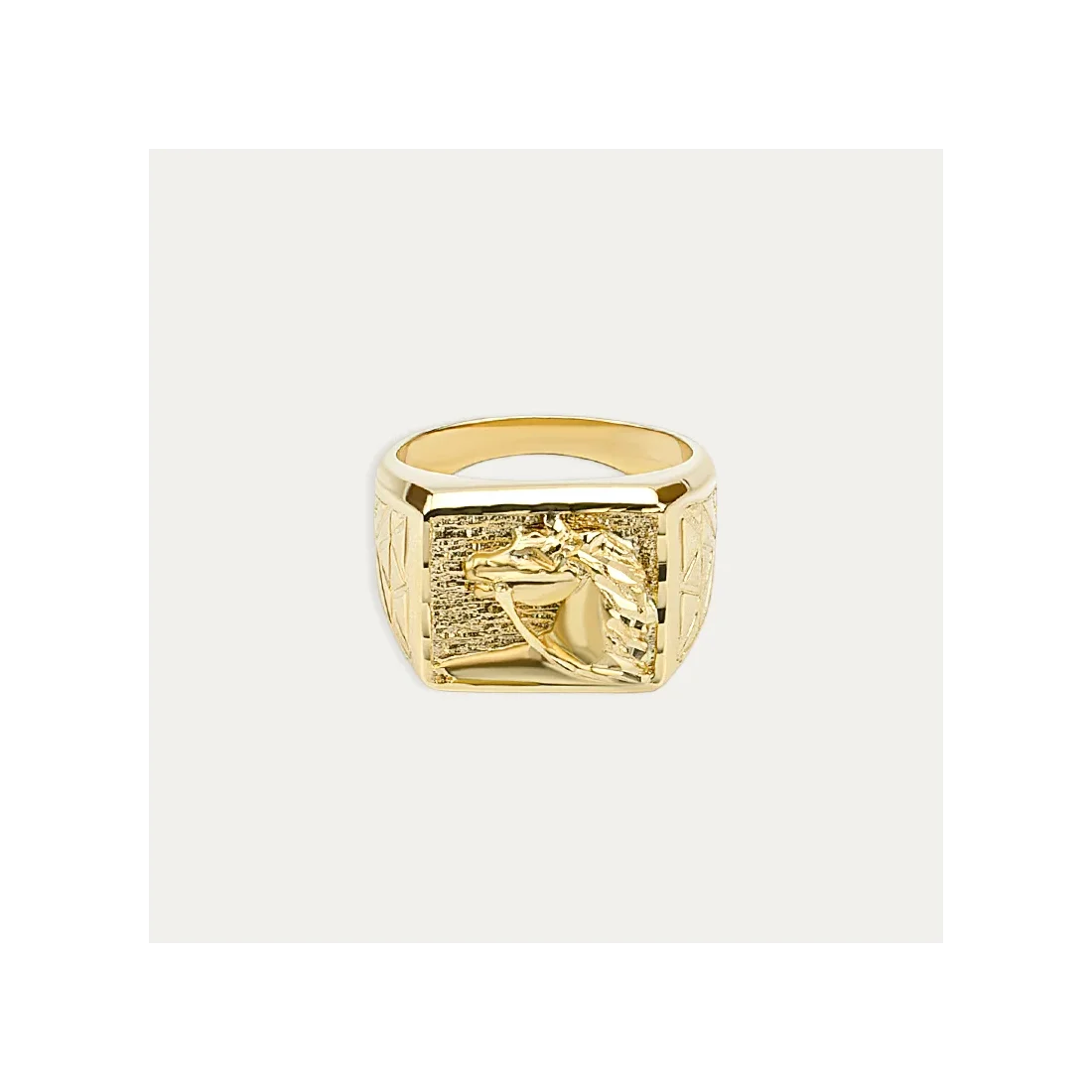 Anillo en Oro de 18 quilates de Primera Ley. Un sello en forma cuadrada llamativo no solo por su gran tamaño y peso, si no por la imagen en relieve de una cabeza de caballo. Una pieza única que se convierte en el centro de todas las miradas.