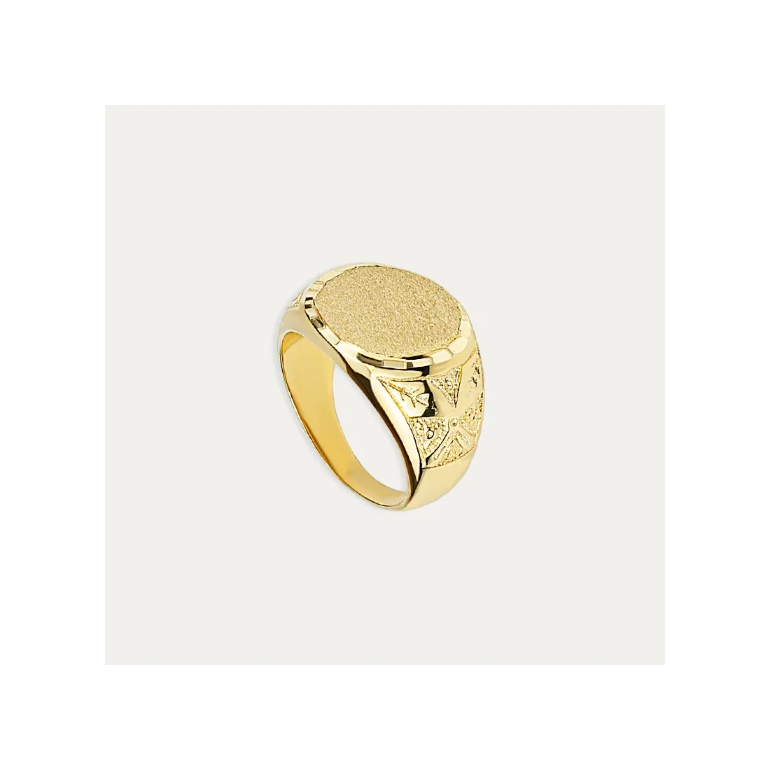 Anillo fabricado en Oro de 18 quilates en forma redonda con detalles laterales en textura. Una pieza elegante, que permite personalización en la cabeza, para darle un toque especial.
