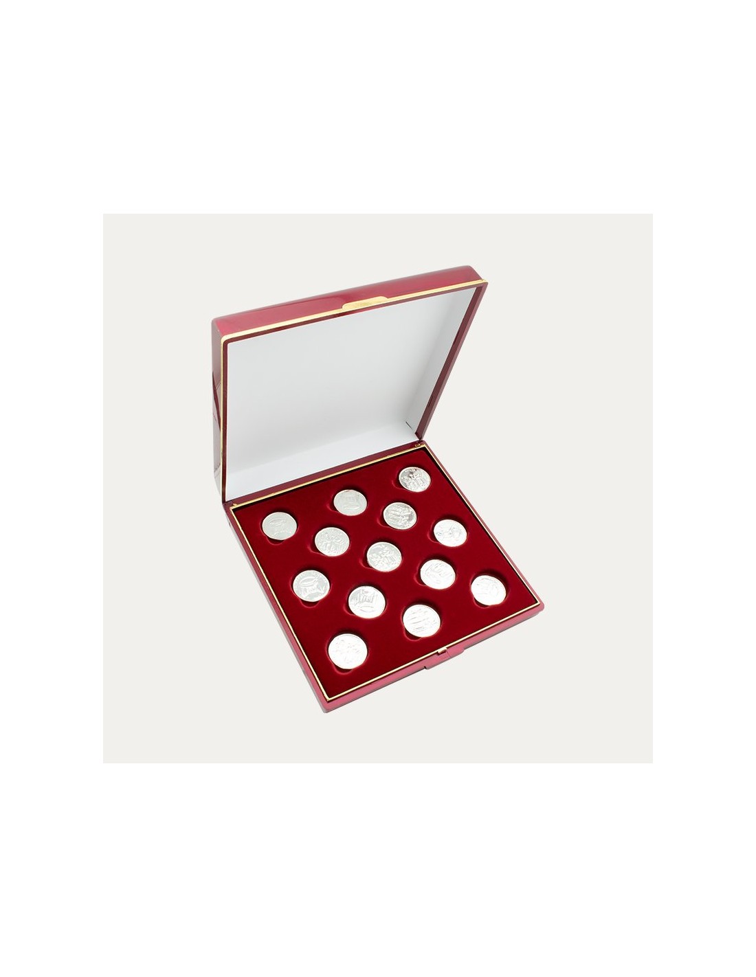 Set de 13 arras de plata con estuche rojo con terciopelo y huecos para colocar las monedas. Es un regalo perfecto para una boda y continuar con la tradición de intercambiarlas en la ceremonia nupcial.