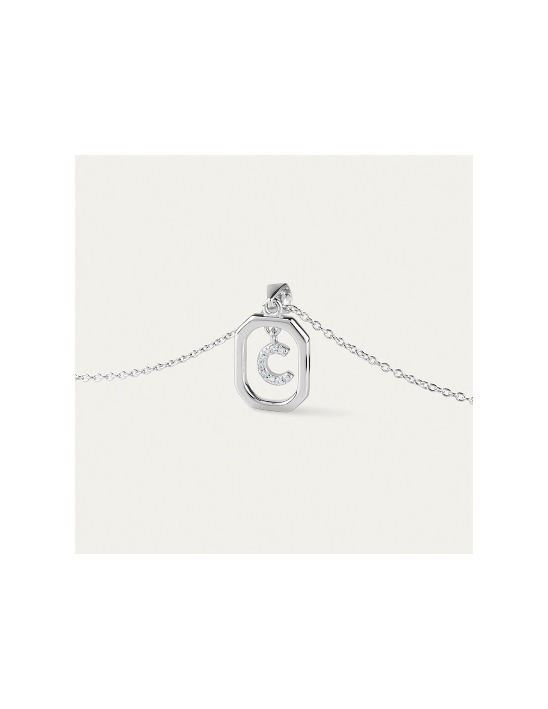 Gargantilla fabricada en Plata de Primera Ley con inicial decorada con circonitas que flota en el interior de un marco octogonal. Una joya elegante con un toque especial y llamativo gracias a su cuidado y delicado diseño.