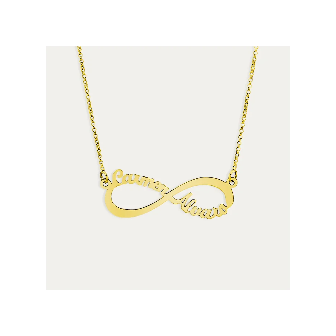 Gargantilla en Plata Primera Ley dorada con forma de infinito y se pueden personalizar con hasta 4 nombres. No se pueden grabar acentos.