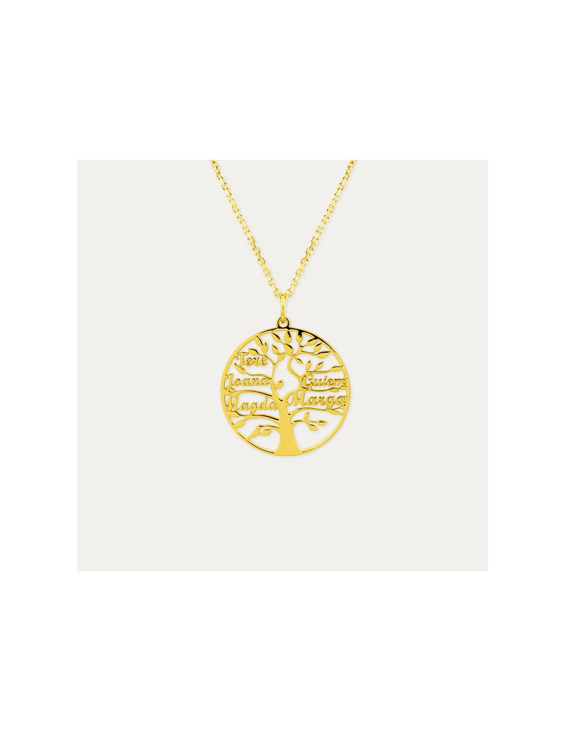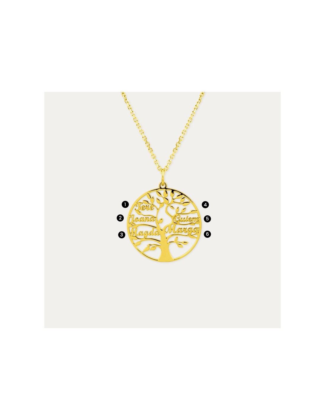 Collar de plata dorada con motivo árbol de la vida y seis nombres (ver imagen dos para orden de nombres).