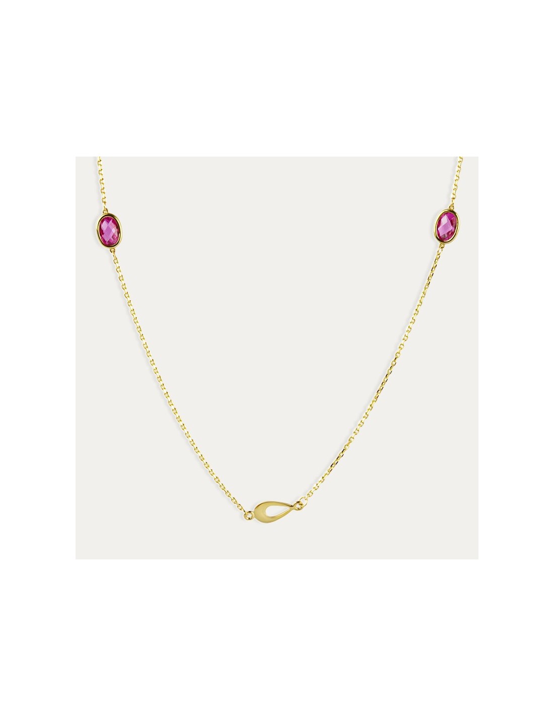 Gargantilla en Oro de 9 kilates con motivo lagrimas y dos piedras engastadas de color espinela. Una pieza elegante que combina con la pulsera de la Colección Khamil.