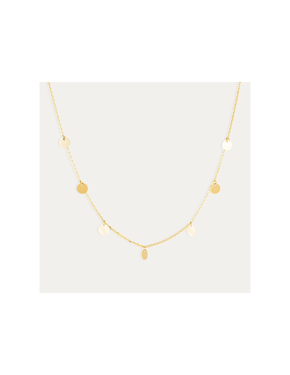 Gargantilla de Oro de 9 kilates decorada con varios colgantes circulares que aportan versatilidad y brillo gracias a su acabado a modo de reflejo.