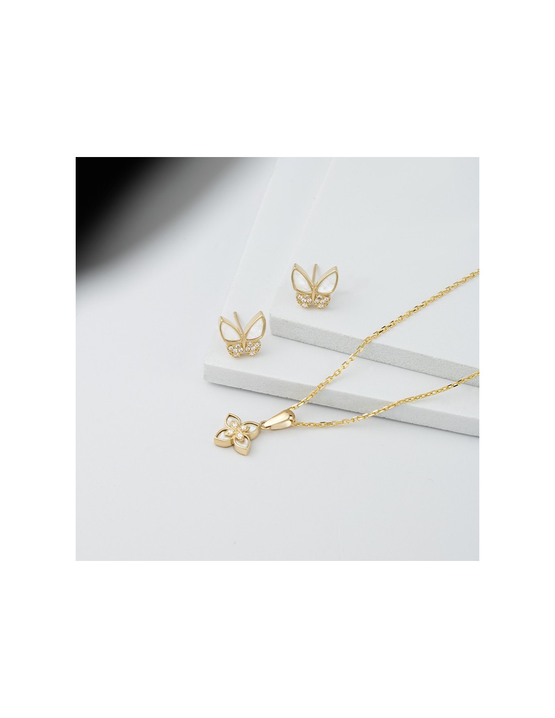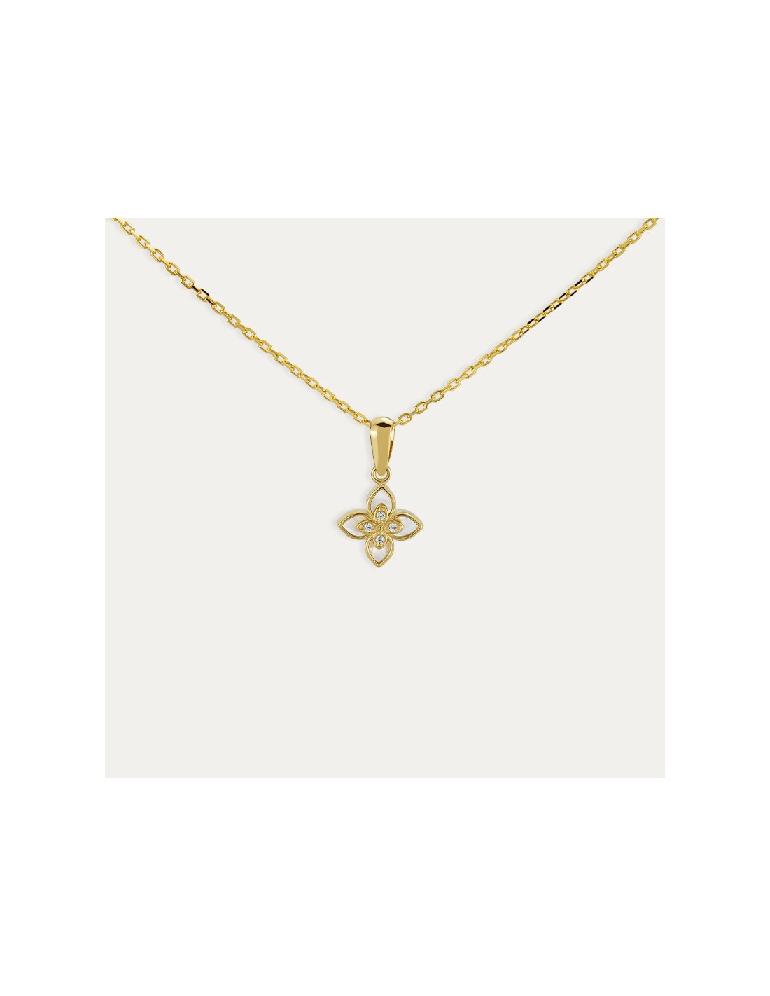 Cadena más colgante fabricado en Oro de 9 kilates en forma de flor con pétalos de nácar y circonitas en el centro. La colección Chlóe tiene un brillo especial gracias a su diseño único y original.