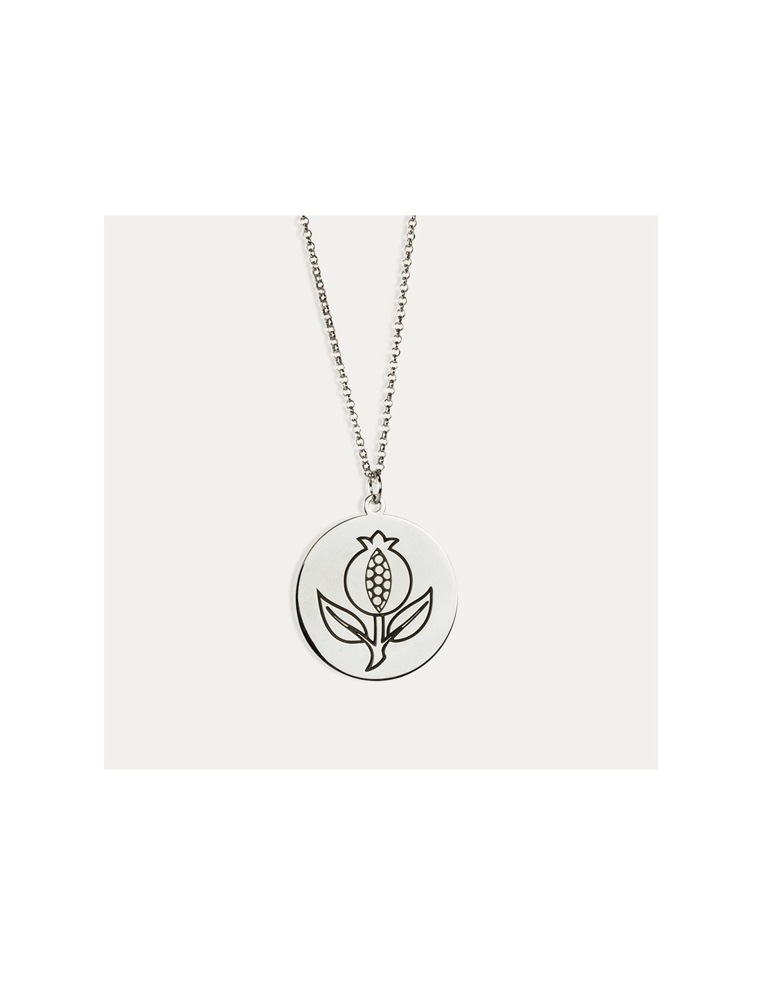 Cadena más colgante en Plata de Primera Ley, un disco con una rama de granada grabada en negro. Como emblema monárquico español y principalmente acuñada por Enrique IV.