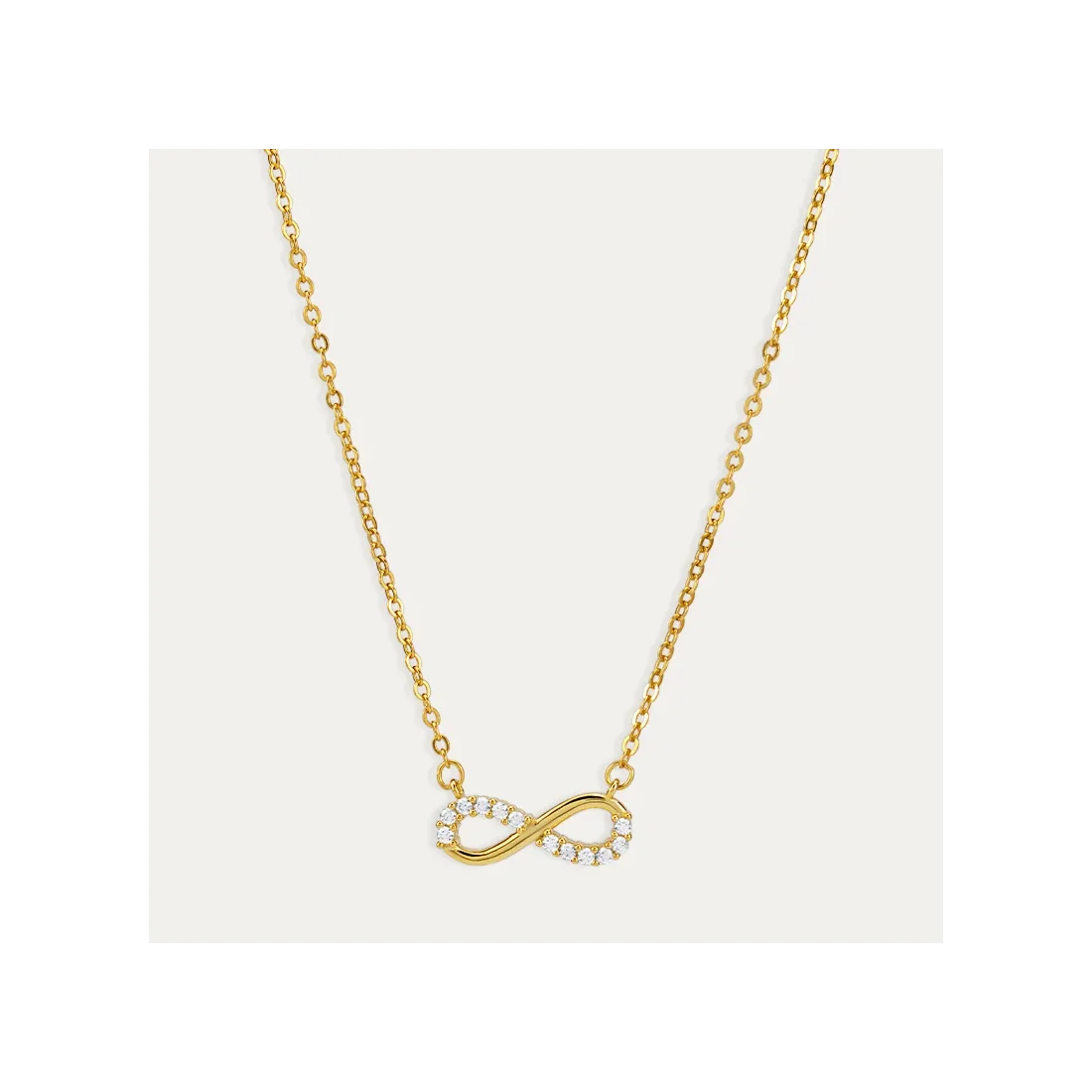 Cadena más colgante con forma de infinito fabricado en plata dorada con pequeñas circonitas.