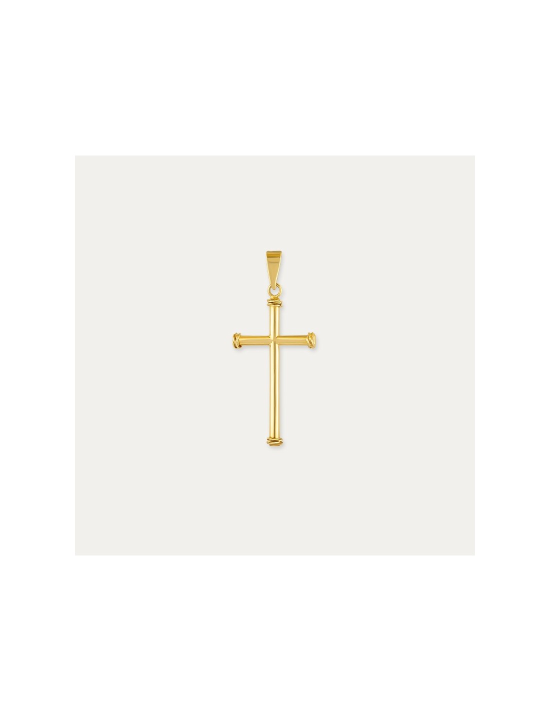 Cruz de estilo tubular con relieve en las terminaciones y acabado liso brillo, elaborada en Oro de 18 kilates. Perfecta como joya de Primera Comunión.
