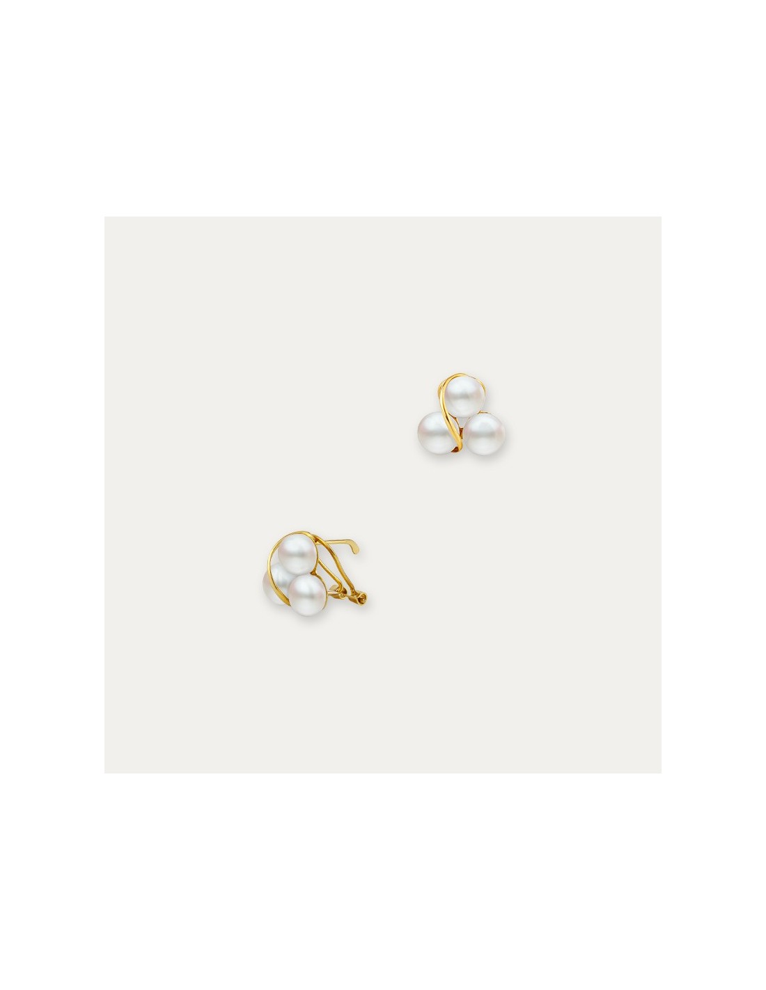 Pendientes Oro en 9 kilates decorado con 3 perlas y terminado en un cierre omega.