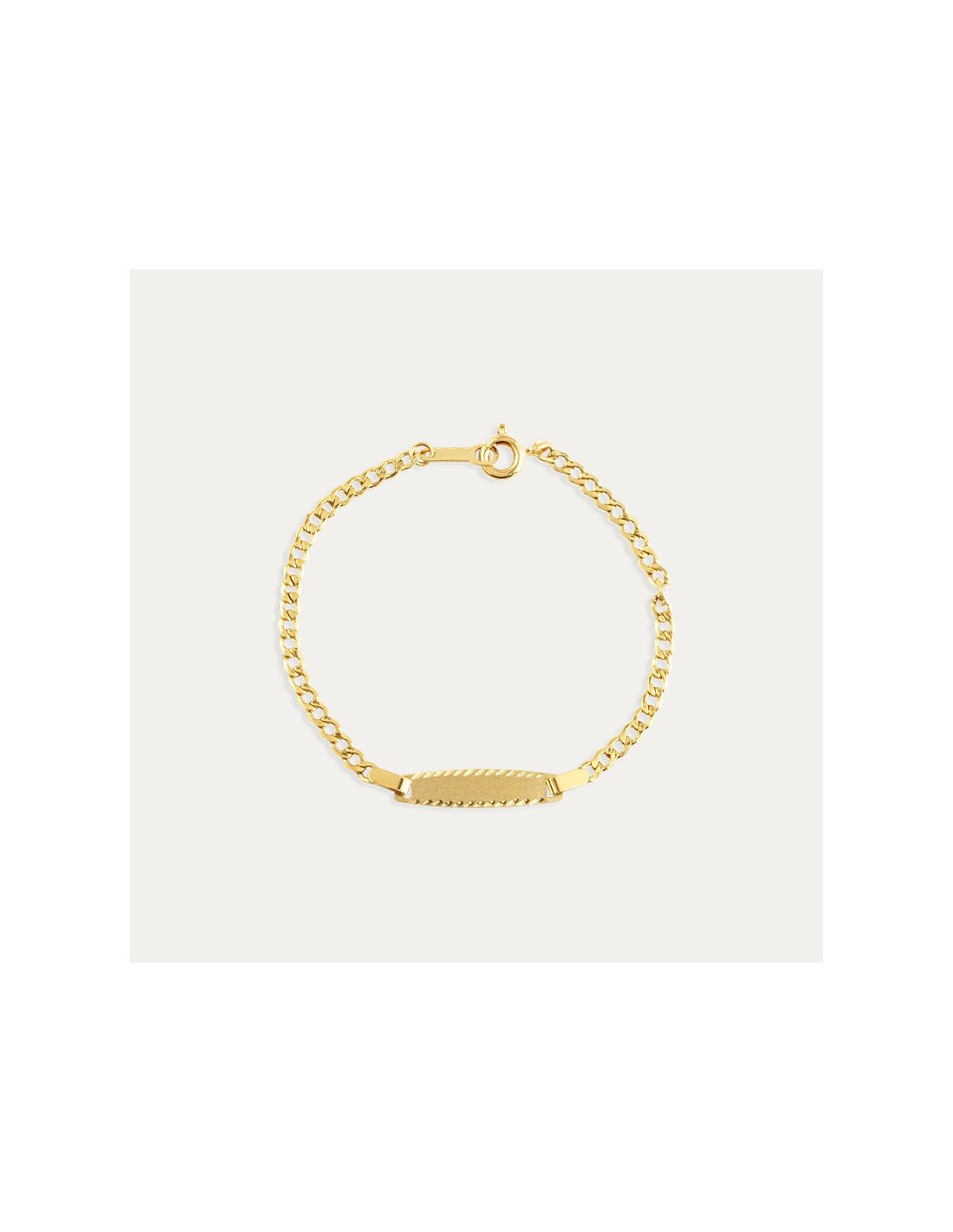 Pulsera de Oro infantil de 18 quilates, con una pequeña chapa para grabar un nombre o fecha especial.