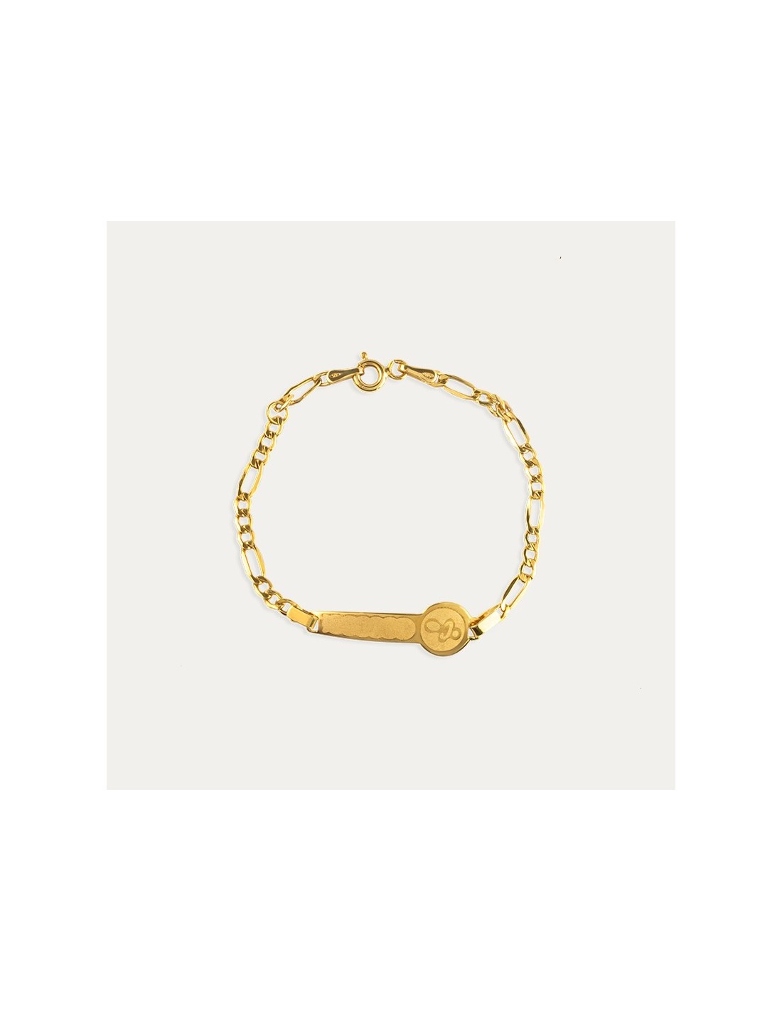 Pulsera de Oro infantil de 9 quilates, con una pequeña chapa para grabar y un motivo de un chupete. Un regalo muy especial.