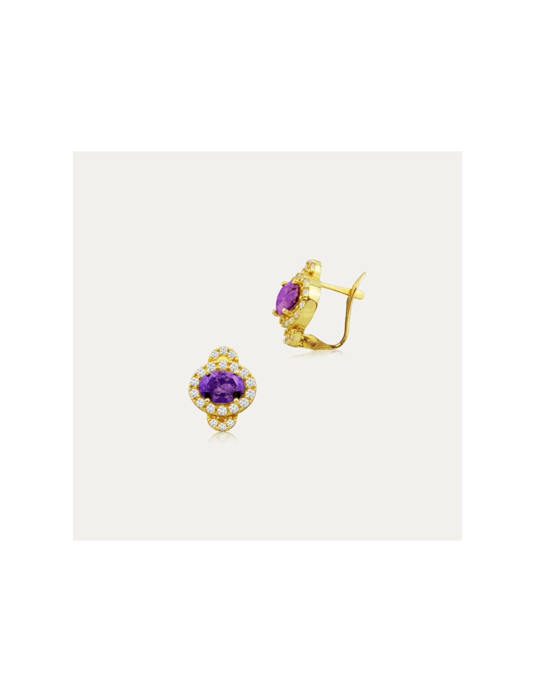 Pendientes en Oro 9 kilates con una piedra grande color Amatista y circonitas blancas en el borde. Hacen juego con la sortija Zadar y quedan espectaculares con cualquier estilo.