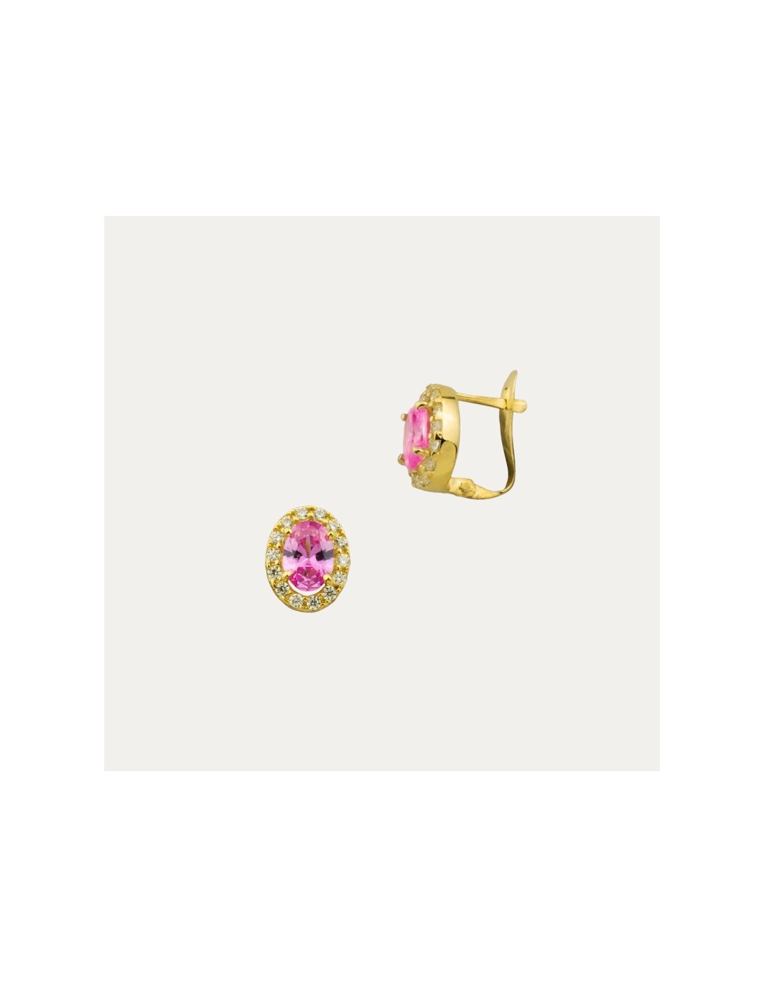 Pendientes en Oro de 9 kilates con una piedra grande de color Rosa de Francia y un aro de circonitas blancas. Una pieza que combina con la sortija del mismo nombre y completa tu look.