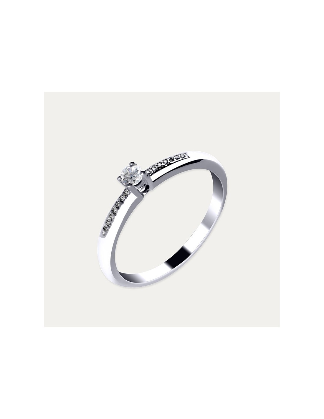 Anillo en Oro 18 kilates blanco con diamante creado en laboratorio en cuatro garras seguido a ambos lados de diamantes. Una muestra de amor eterno en una joya inigualable.