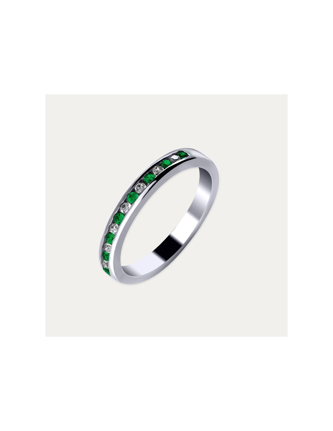 Sortija en Oro 18 kilates blanco con diamantes creados y esmeraldas en línea. Un anillo para una gala elegante.
