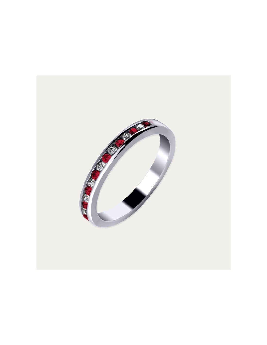 Sortija en Oro 18 kilates blanco con diamantes creados y rubíes en línea. Un anillo para una gala elegante.