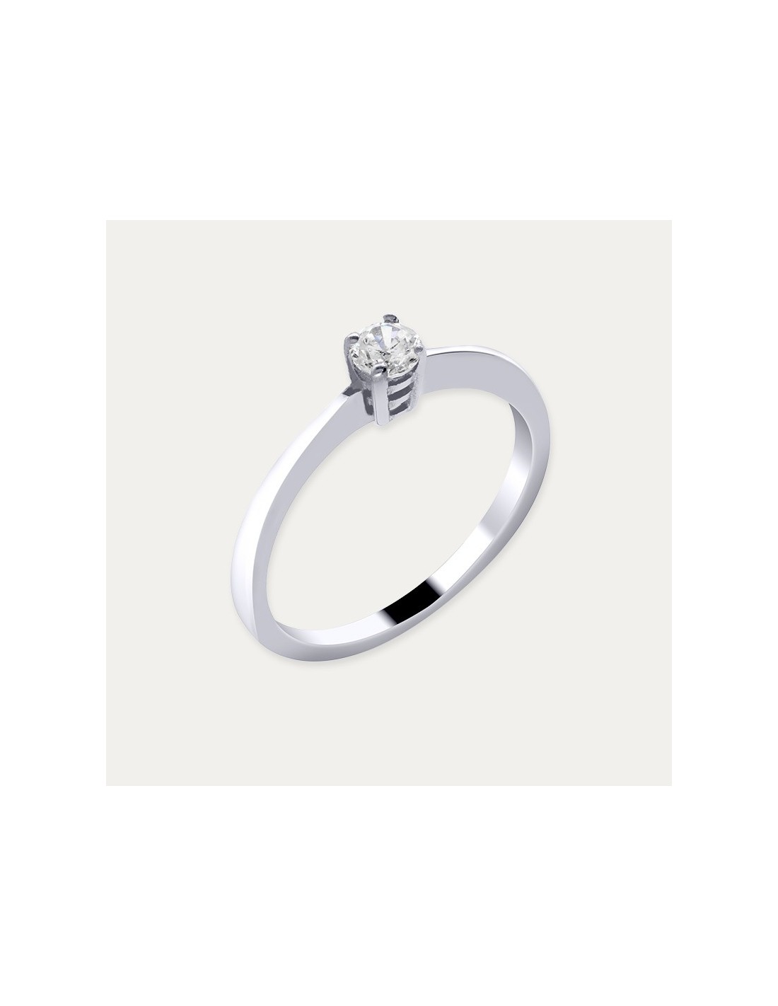 Anillo de compromiso en Oro 18 kilates blanco con diamante creado central sostenido con cuatro garras en una sencillez radiante y sofisticada.