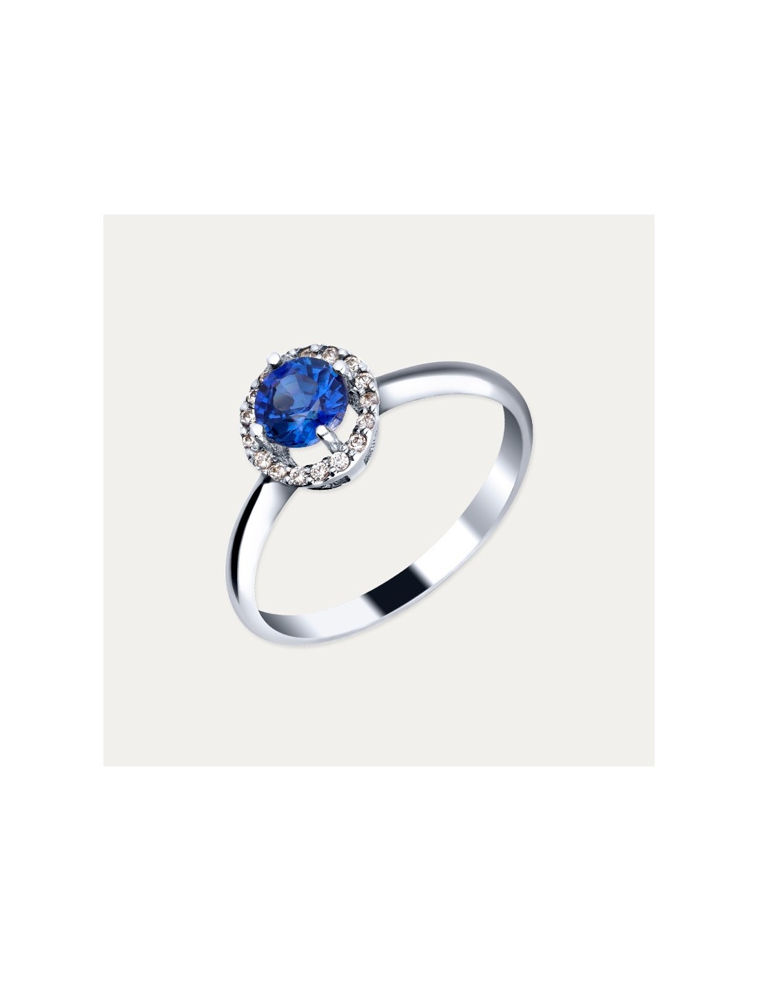 Sortija en Oro 18 kilates blanco con un zafiro redondo y diamantes creados alrededor. Un anillo fascinante lleno de belleza.