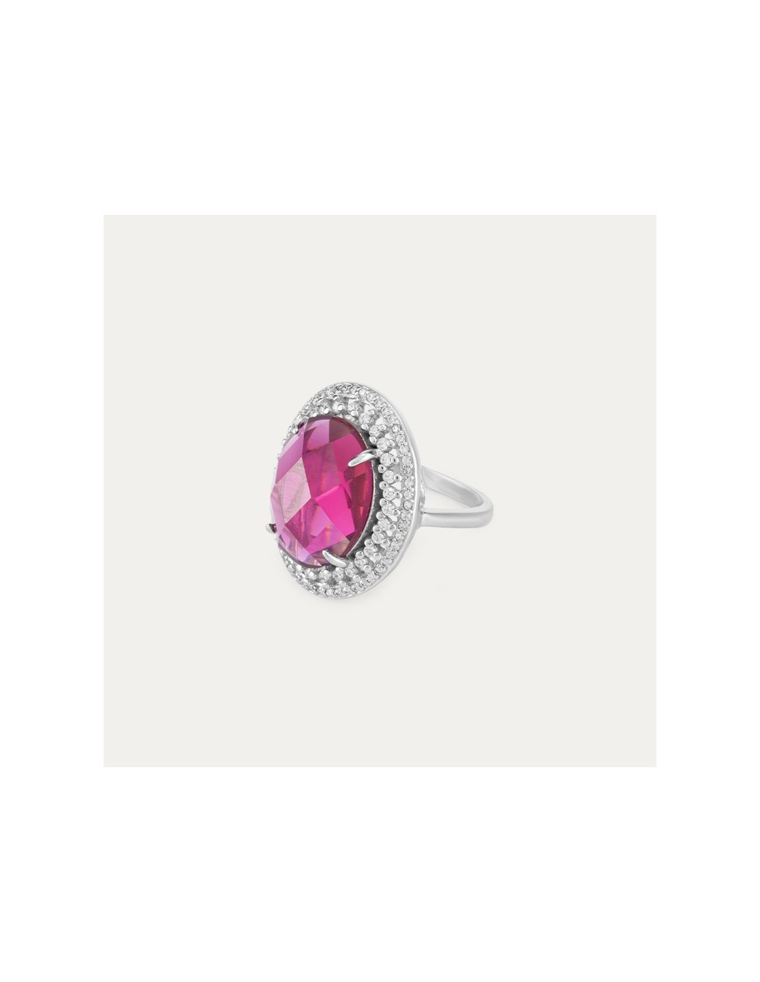 Anillo en Plata Primera Ley 925 milésimas de estilo clásico y elegante. Con circonitas decorando toda la pieza y una piedra rosa en el centro.