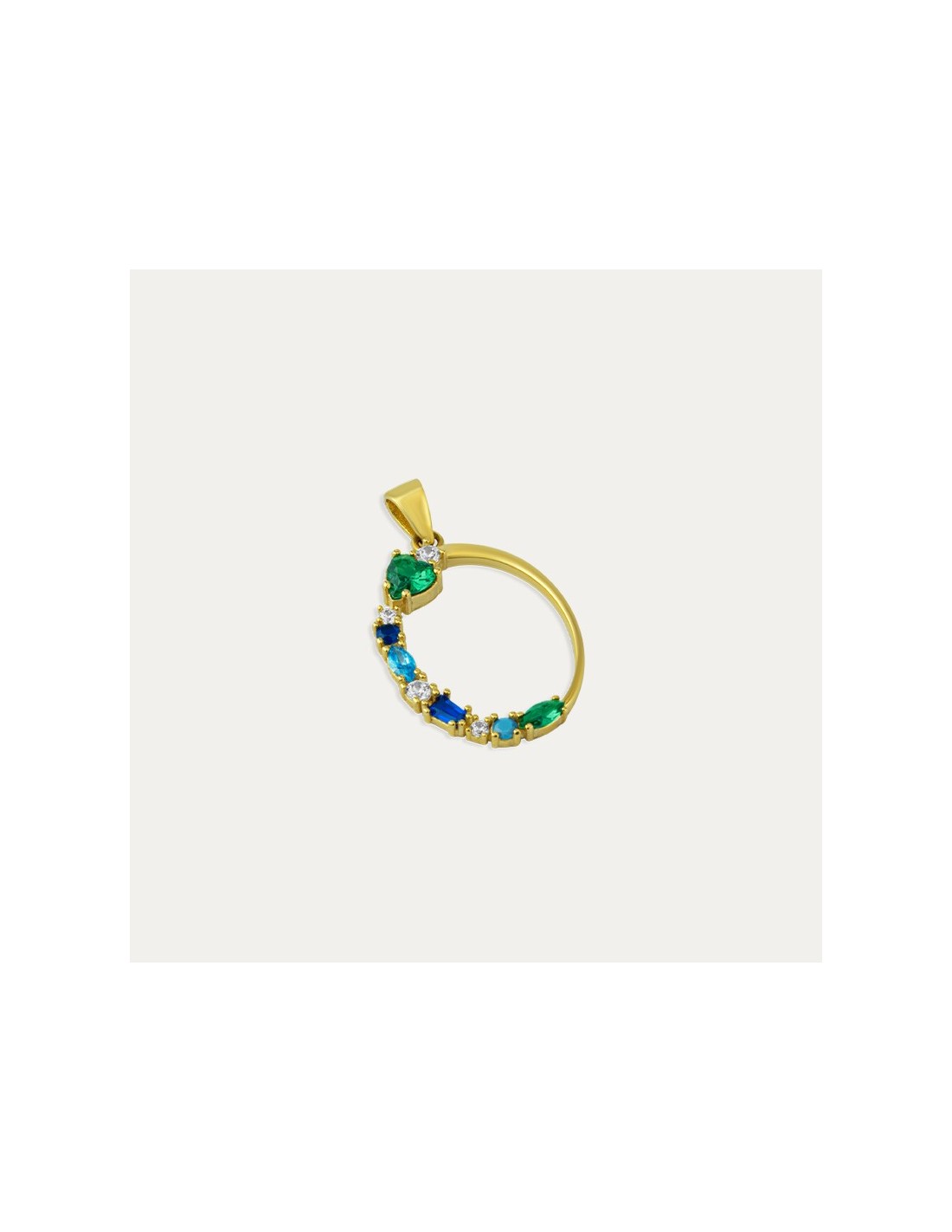 Colgante en Oro 9 kilates con forma ovalada y piedras de color decorando un costado, una de ellas, la mas grande, tiene forma de corazón en verde esmeralda. Una joya que combina perfectamente con toda la colección L'Aurora y que podemos lucir en el cuello este verano.