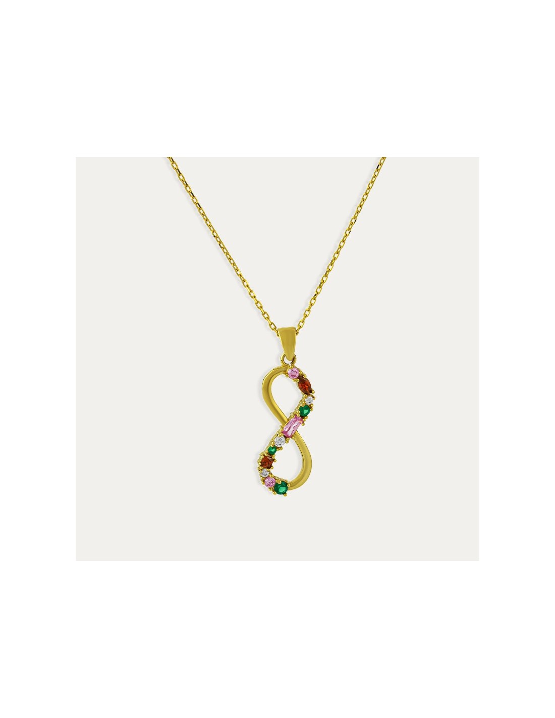 Colgante en Oro 9 kilates con forma de infinito y piedras de color decorando la mitad de la pieza. Este conjunto es ideal para llevar en verano ya que aporta colorido y estilo.
