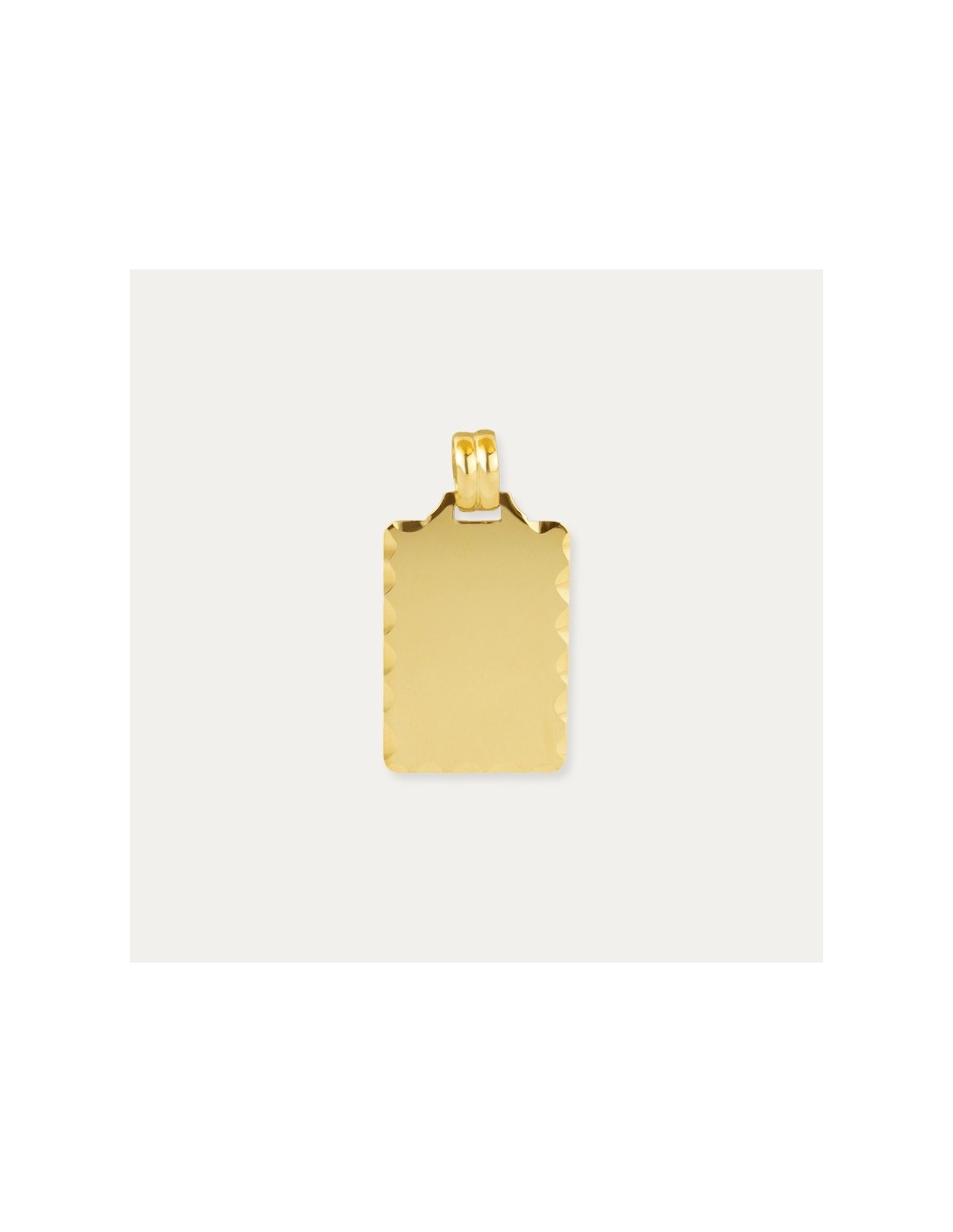 Colgante de chapa rectangular en Oro de 9 kilates con bordes tallados. Podrás personalizarla con una fotografía o grabarla con un texto en ambas caras.