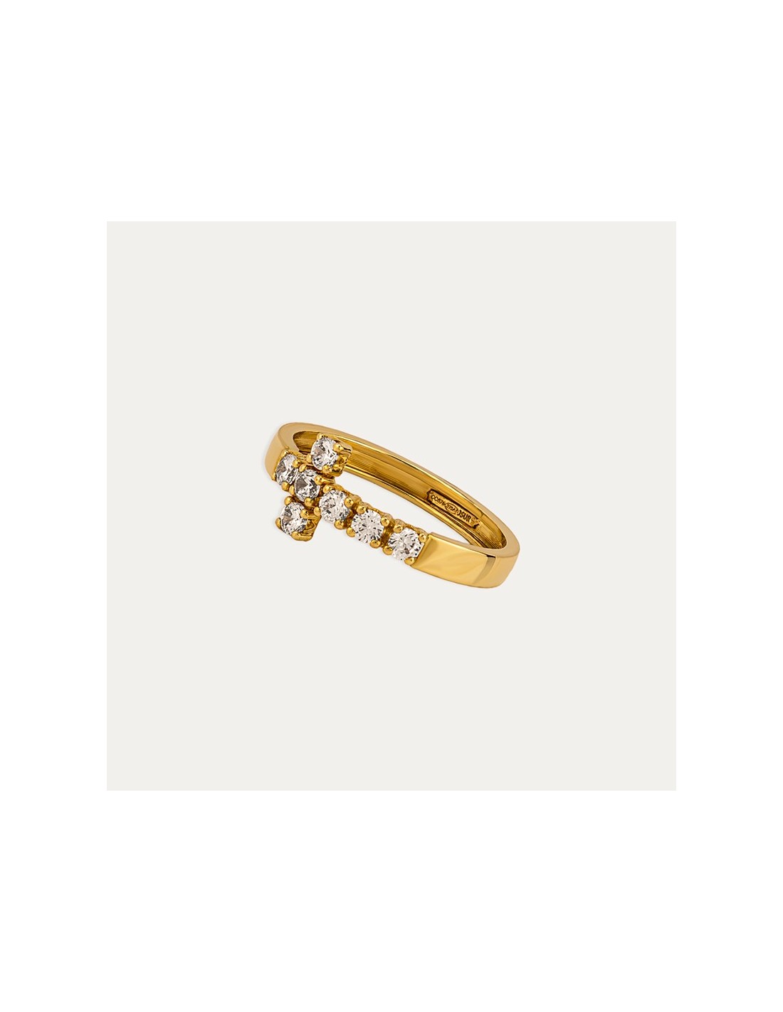 Sortija de oro de 9 quilates con forma de cruz y pequeñas circonitas en su interior.