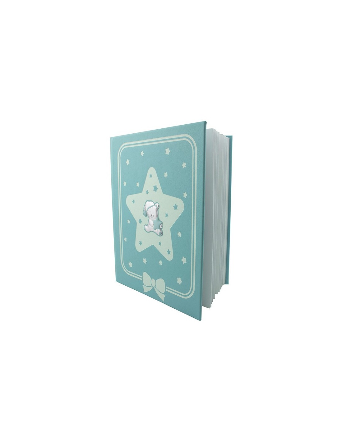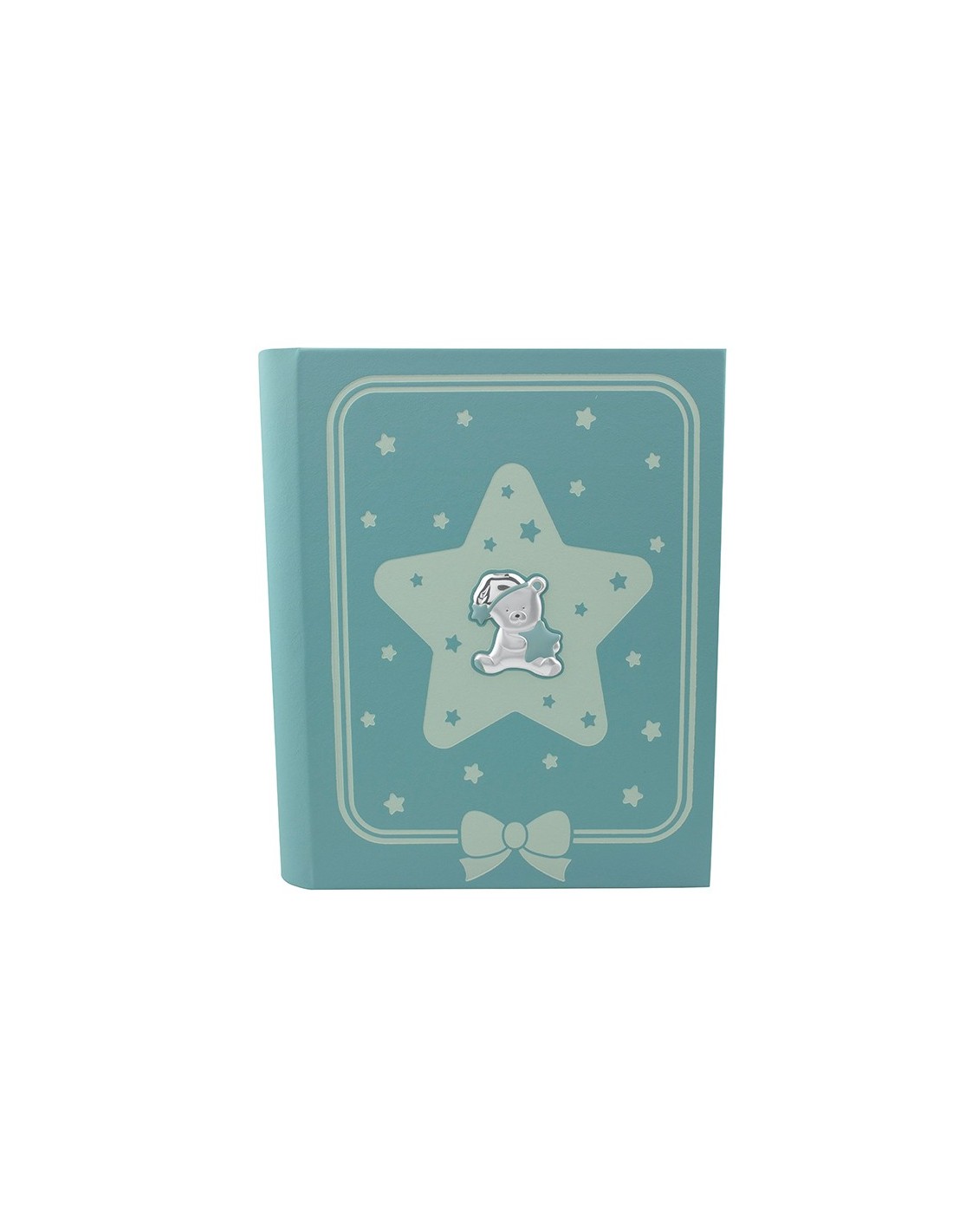 Álbum infantil en color azul con detalle de oso en plata bilaminada. El álbum mide 24 cm x 30 cm y contiene 30 hojas para fotos.