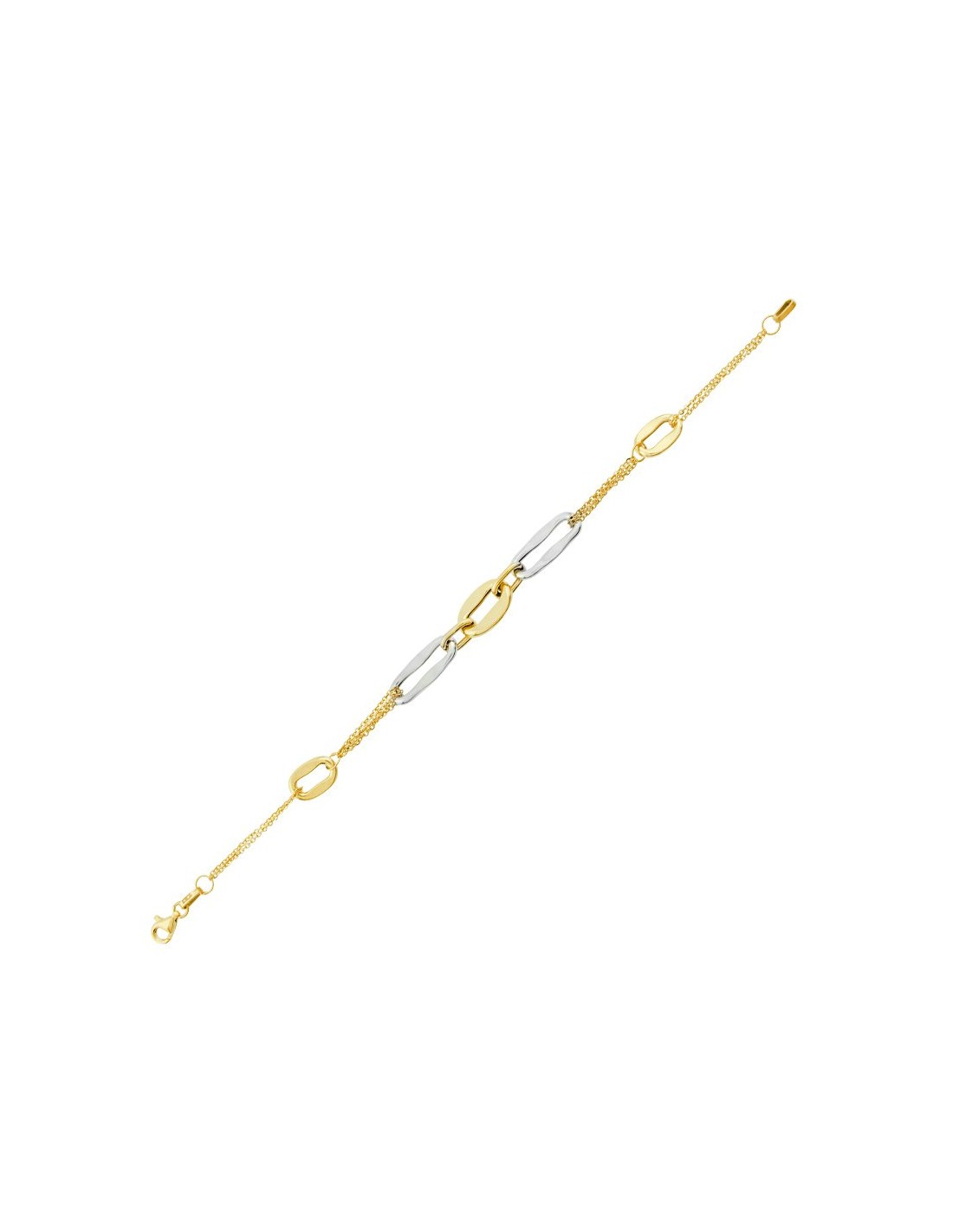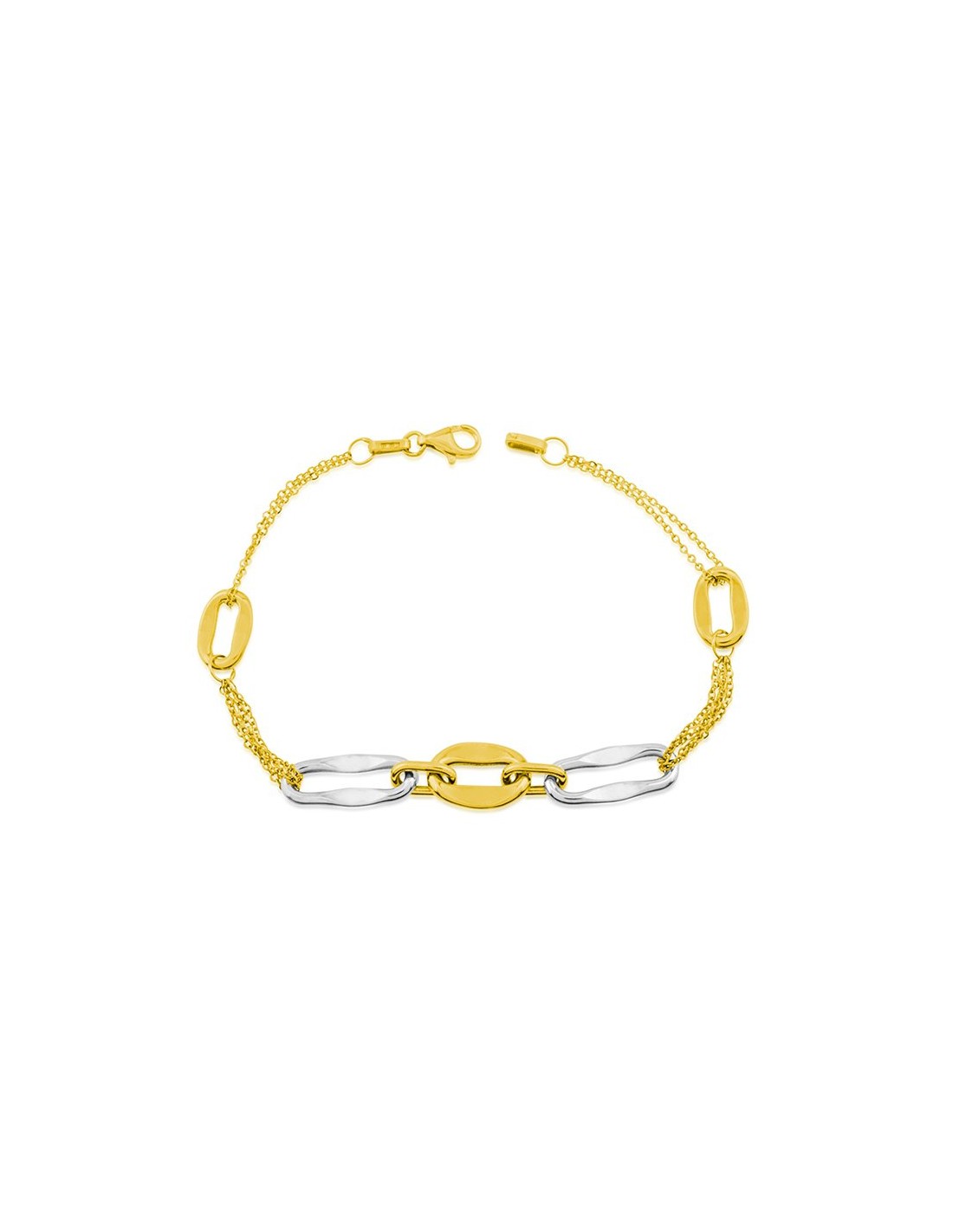 Pulsera en Oro 9 quilates con eslabones diferentes en blanco y amarillo con cierre mosquetón.