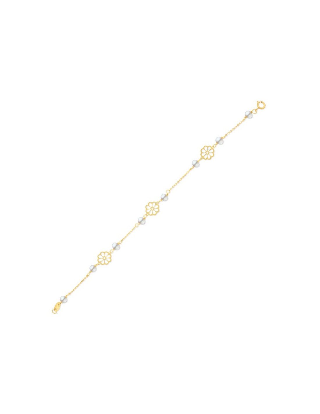 Pulsera Oro 18 kilates infantil con perlas y motivos de margaritas caladas con cierre de timón. Joyas Primera Comunión