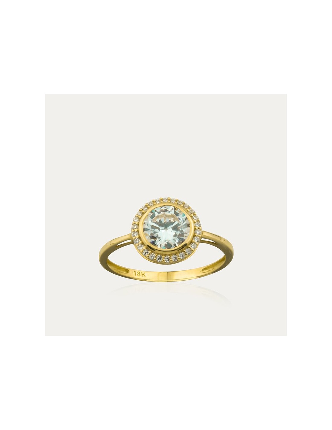 Anillo en Oro de 18 kilates de estilo solitario con un chatón de circonita grande y borde decorado de circonitas pequeñas. Hace juego con unos pendientes con el mismo diseño.