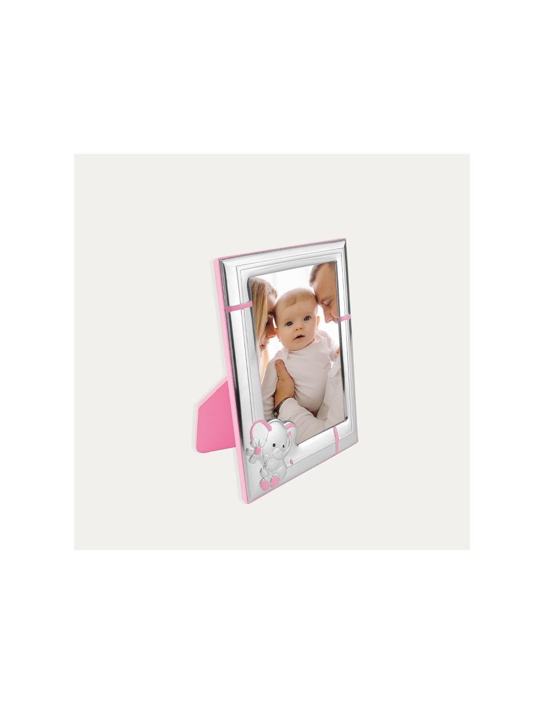 Marco en Plata de Primera Ley 925 mlm infantil con detalle de elefante y fondo rosa cuadrado. Ideal para colocar es recuerdo tan especial.