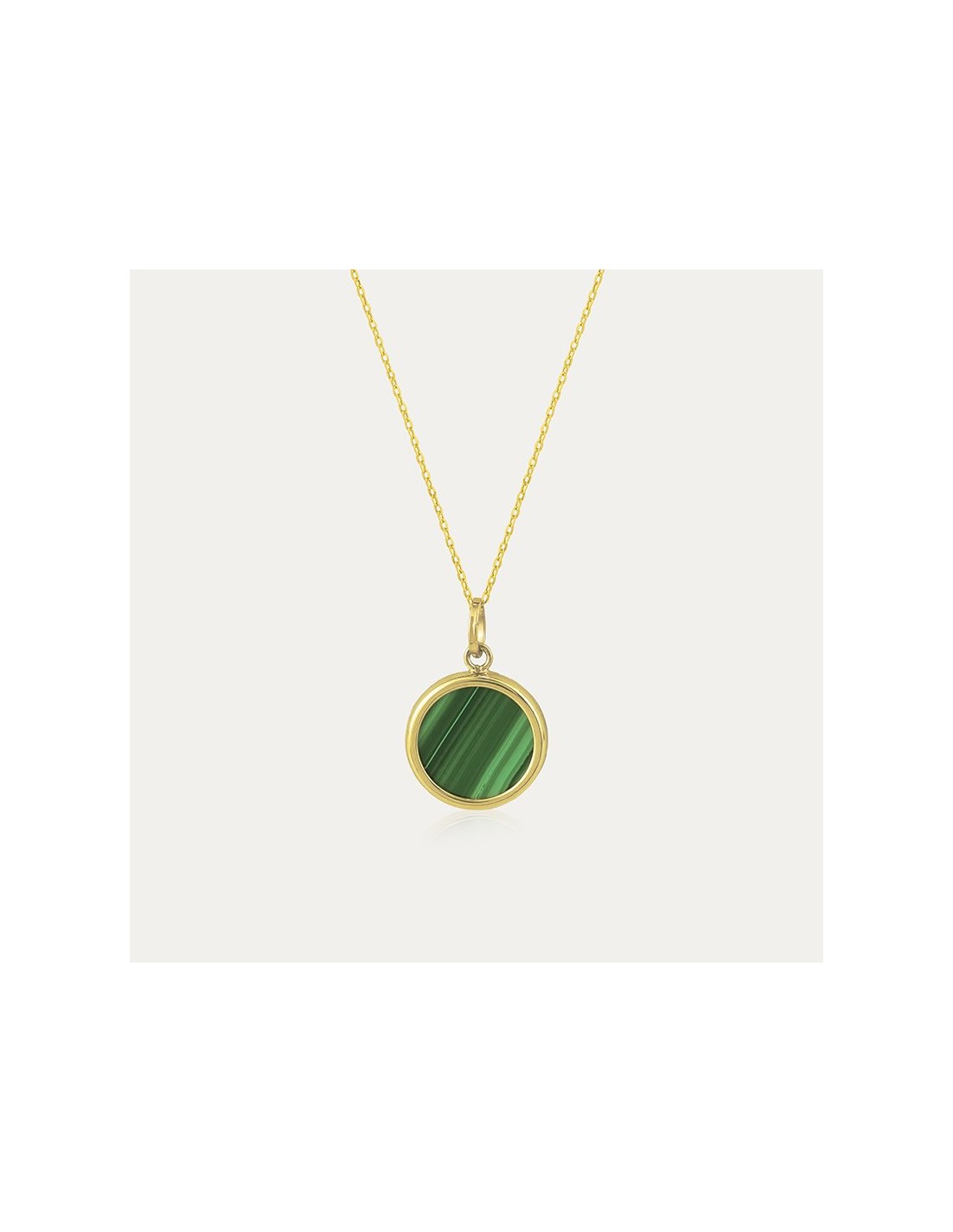 Gargantilla en Oro de 9k con un disco de piedra de Malaquita engarzado en un aro, un diseño fino y elegante.