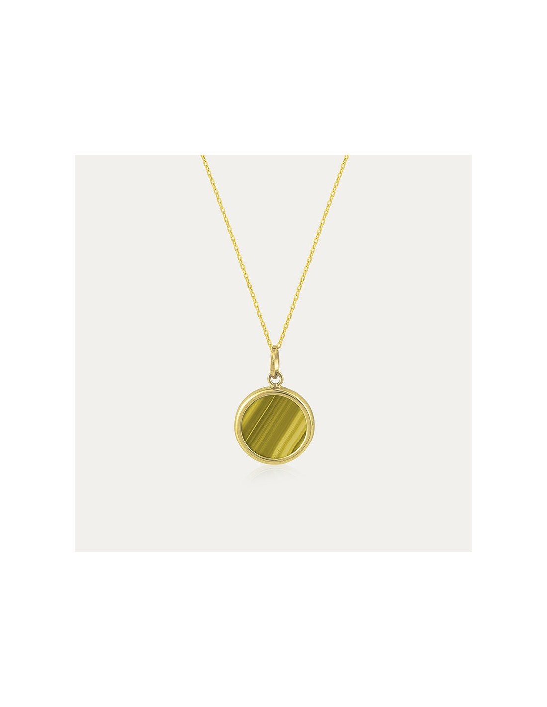 Gargantilla en Oro de 9k con un disco de piedra de Ojo de Tigre engarzado en un aro, un diseño fino y elegante.