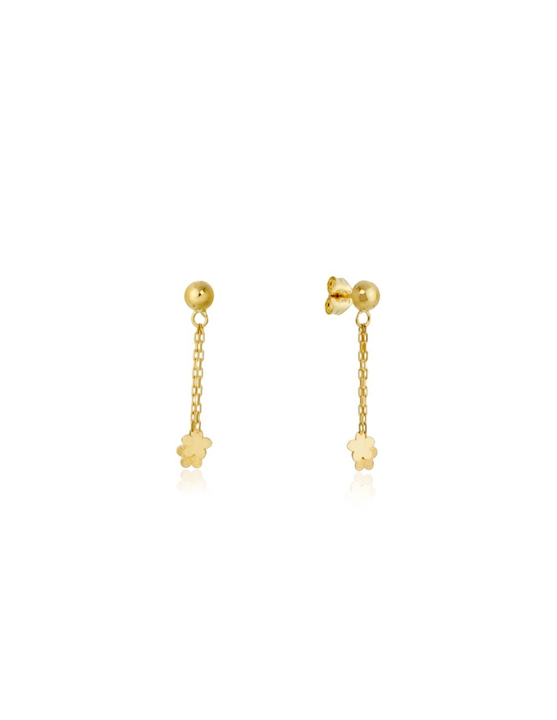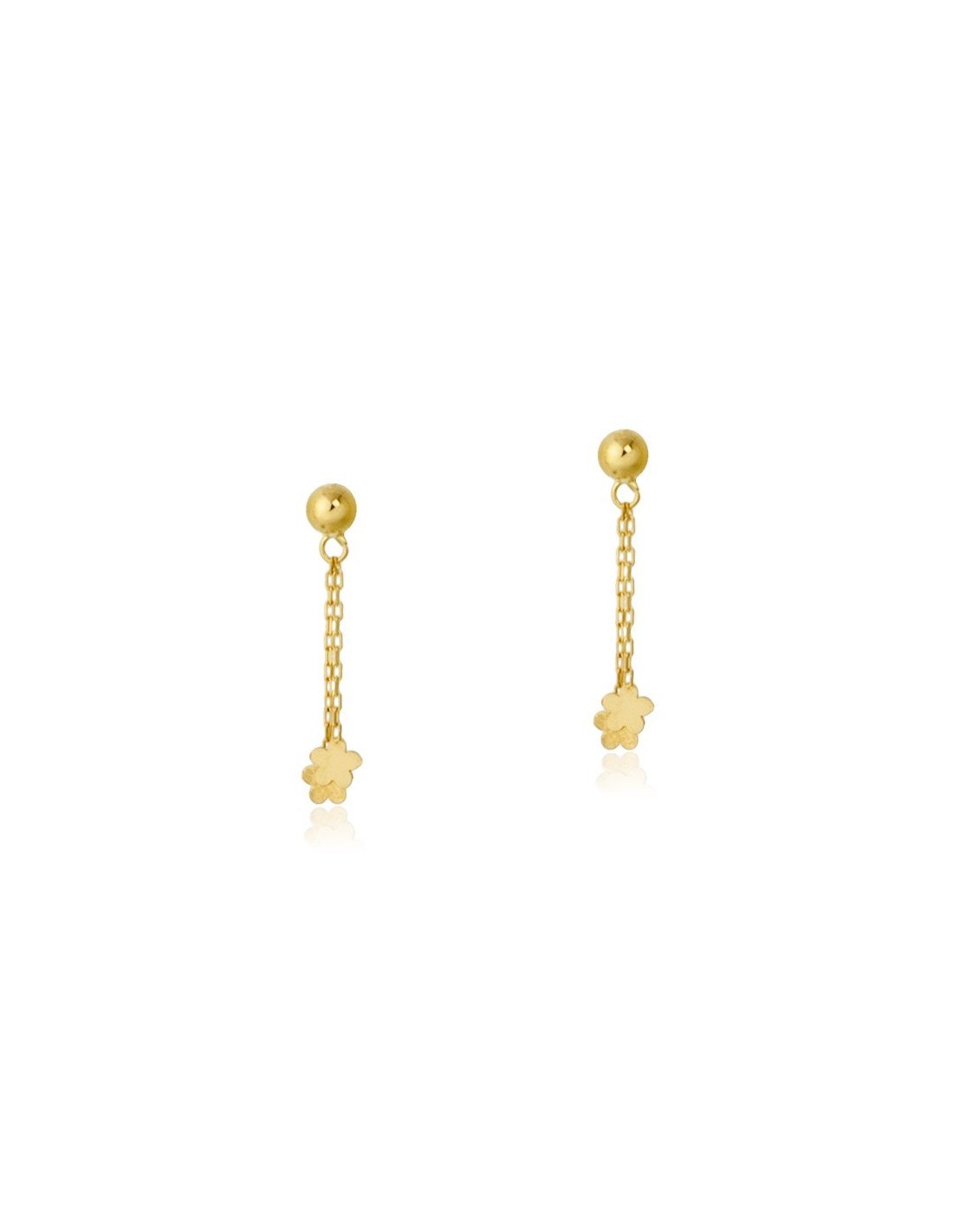 Pendientes de colgar con flores en oro amarillo de 18 kilates. Tienen 25mm de alto, 4mm de diámetro la bola superior y 4mm de diámetro las flores.