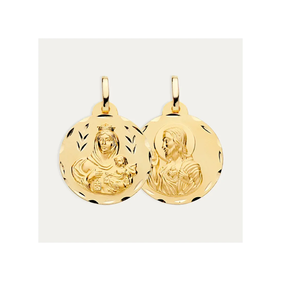 Medalla escapulario en Oro 9 kilates la imagen de la Virgen del Carmen en una cara y en la otra la imagen del Corazón de Jesús.