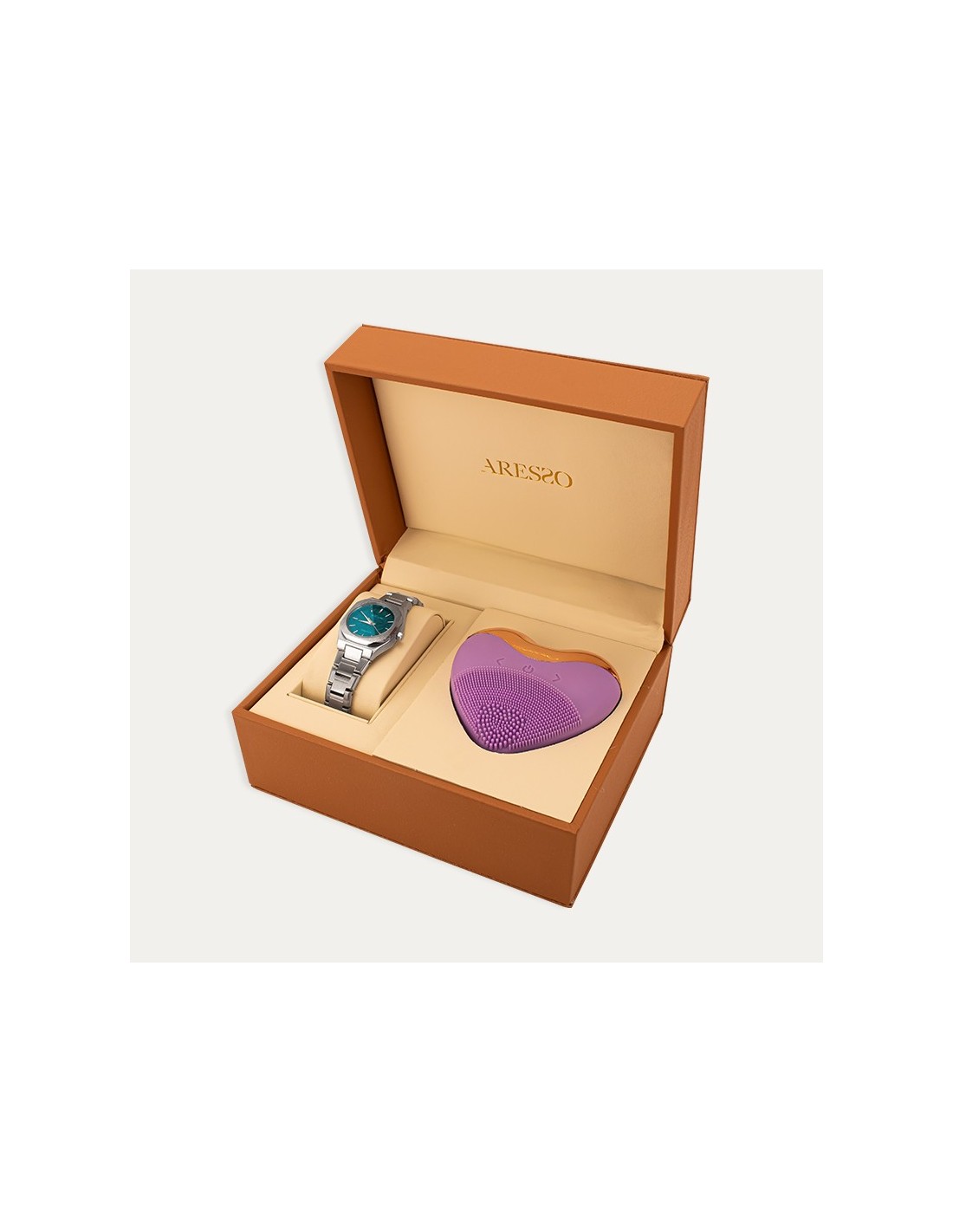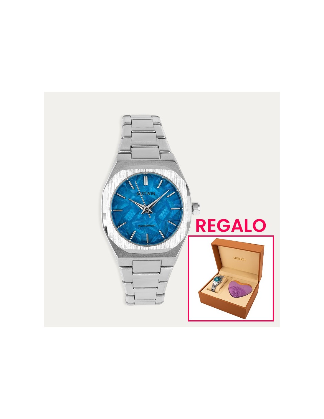 Reloj para mujer en acero de la marca Bestwin con esfera en color azul con acabado de textura. El pack incluye una regalo de masajeador facial en forma de corazón de silicona con varios modos que te facilitaran el cuidado de tu piel.