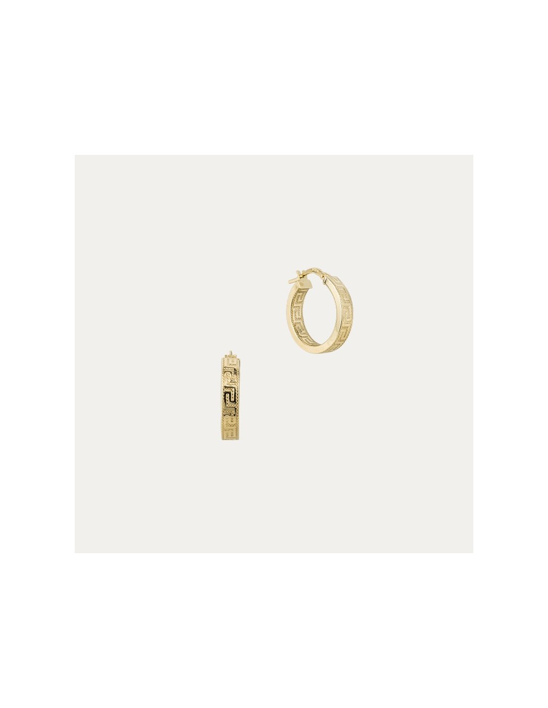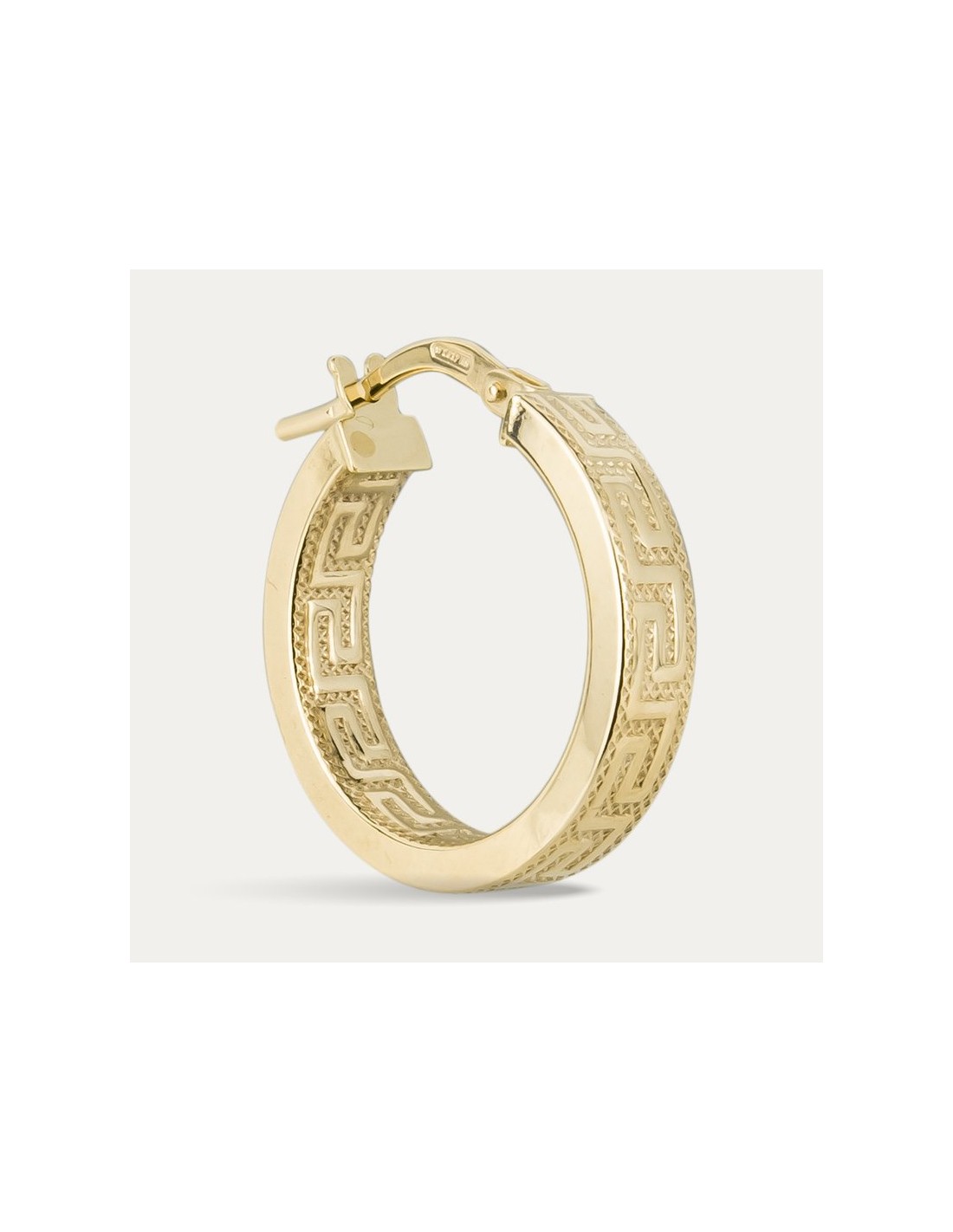 Pendientes de media caña en Oro de 9 quilates con grabado de greca ideal para acompañar su pulsera a juego.