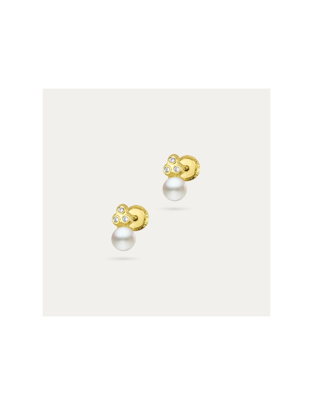 Pendientes en Oro de 18 quilates cortos con tres piedras en un trébol acabados con una perlita. Ideal para un detalle en un día muy especial.
