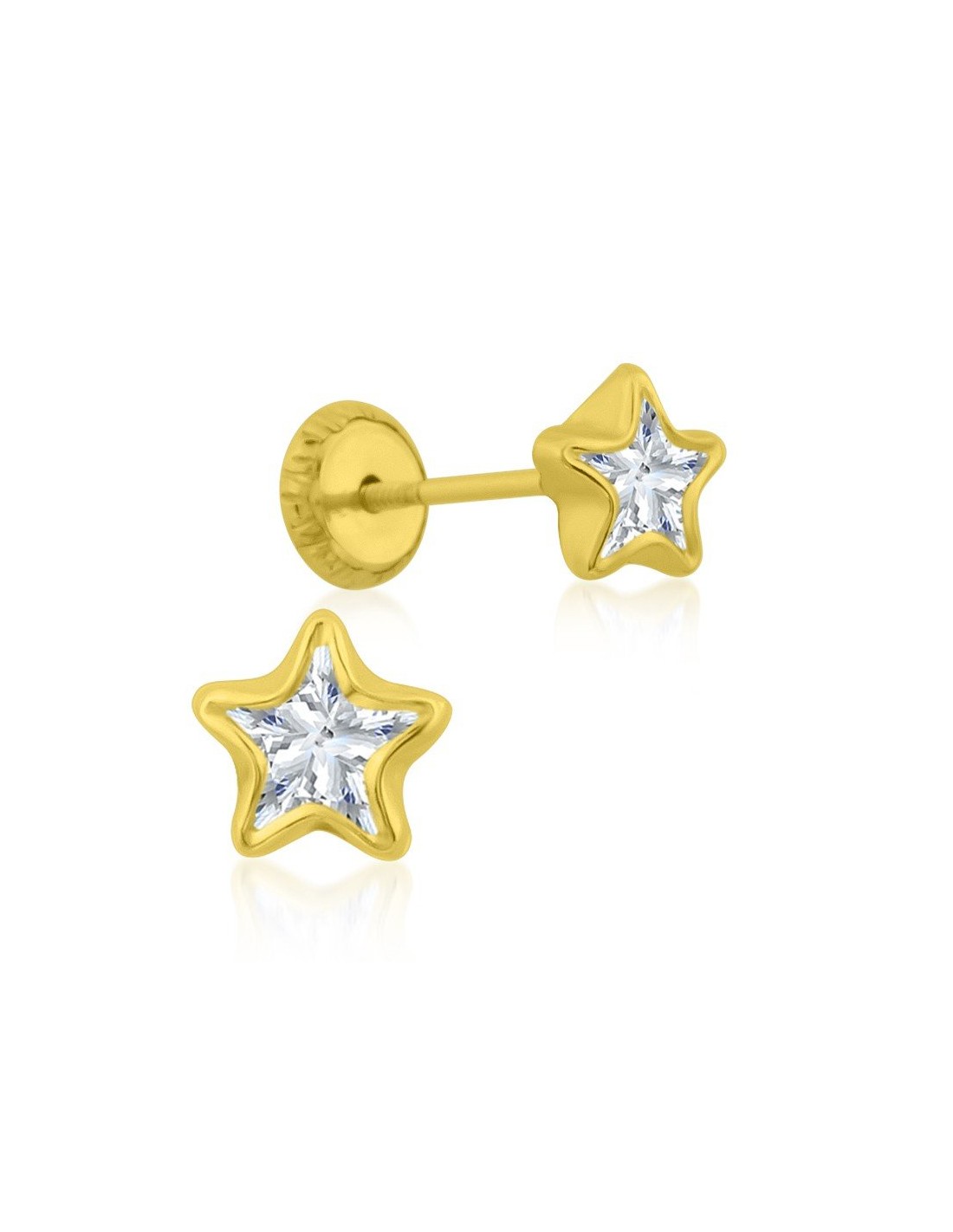 Fabricados en oro 9K, con forma de estrella y acabados en brillo pulido. Cuentan con una circonita engastada dentro del motivo.